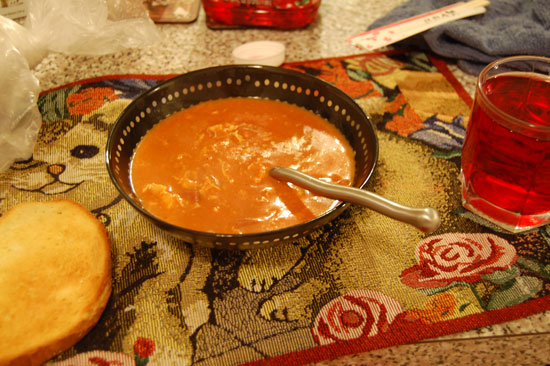 Abends machte ich mir eine Tomatensuppe mit Zwiebeln und Eiern. Die Heizung läuft gut, draußen ist es sehr kalt und rutschig.