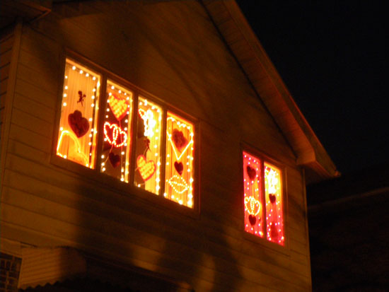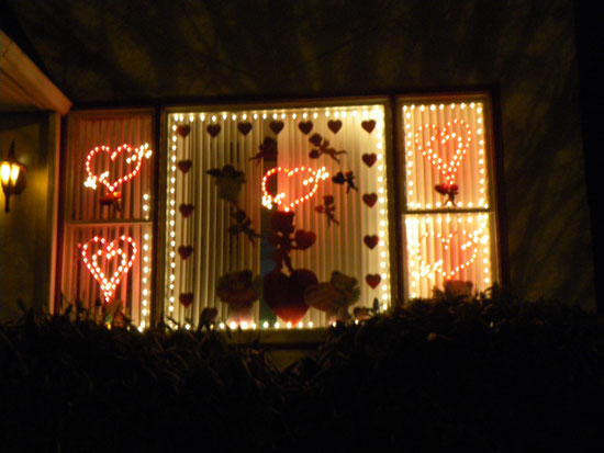 Arbeit wies ich heute etwas ab. Ist schließlich Sonntag. Das viele Essen machte aber etwas Sport erforderlich. Ich joggte eine Runde um ein paar Blocks. Viele Fenster sind für den nahenden Valentins-Tag dekoriert.