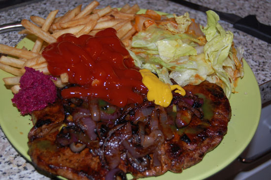 Das Steak wurde mit Zwiebeln gebraten. Eigentlich für 2 Personen gedacht, doch jeamnd hatte eher Appetit auf Sushi. Ich aß das Steak alleine, bekam Salat vom Sushi. Das war am Ende eine Riesenportion, die sehr gut schmeckte. Nach so viel Essen konnte ich mich kaum mehr bewegen. Nach ein paar Stunden ging’s wieder.