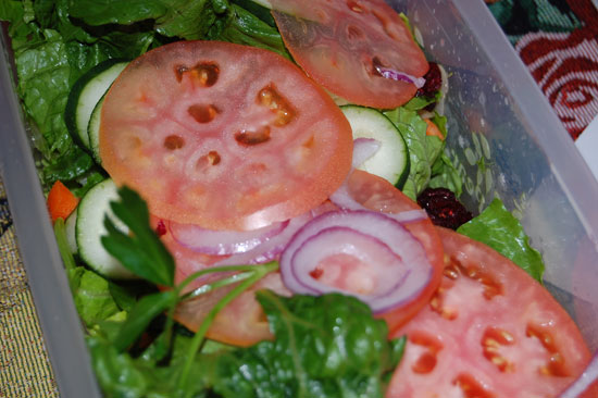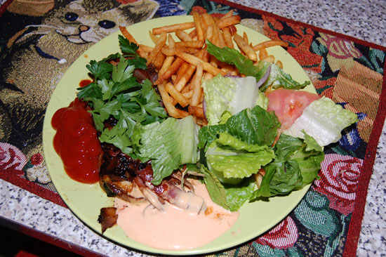 Jemand machte einen tollen Salat. Abends briet ich 2 kleine Steaks, machte Pommes in der Pfanne und hatte so ein geniales Abendessen.