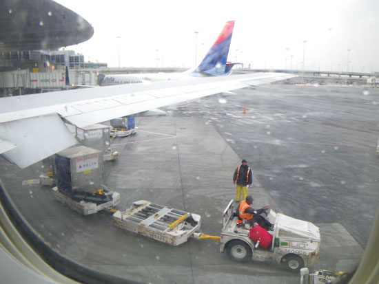 Dem Taxifahrer wollte ich erst $40 geben, die Fahrt kostete nur $25, was ich vergessen hatte. Mit $32 gab’s für ihn auch ein gutes Trinkgeld. Bei Delta gab’s ein Problem mit dem Rucksack. er brachte 60 Pfund auf die Waage, maximal erlaubt waren 50. Wenn ich um die $150 Übergewichtsgebühr herumkommen wollte, musste ich ein paar Sachen umverteilen. In meinen kleinen Rucksack steckte ich den Kabelbeutel und siehe da: 50 Pfund exactly. Den kleinen checkte auch ein – 27 Pfund nun. Die ganze Technik bis auf den Laptop also als normales Gepäck. Hoffentlich geht das gut.