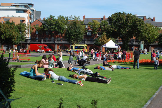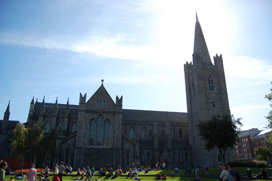Weiter ging’s zum Dublin Castle. Touristengruppe unterwegs auch bei Dublina. Chrust Church und die Vikinker Ausstellung interessierte mich wenig. Ich saß lieber herum, machte auf locker und Photos. Heute sind es 5 Jahre, seit ich den Blog startete. Ein paar Tage sind ohne Photos aber die sind irgendwo, fertig zum Einsortieren. Jetzt könnte ich eigentlich aufhören – aber keine Photos bei dem Wetter? Noch eine Kirche (St. Patrick’s?) mit sehr weichem Rasen. Der iPod ist nützlich, im Park machten Leute Tanz und so nach Musik und einem Buch. Keine Ahnung, was das war.