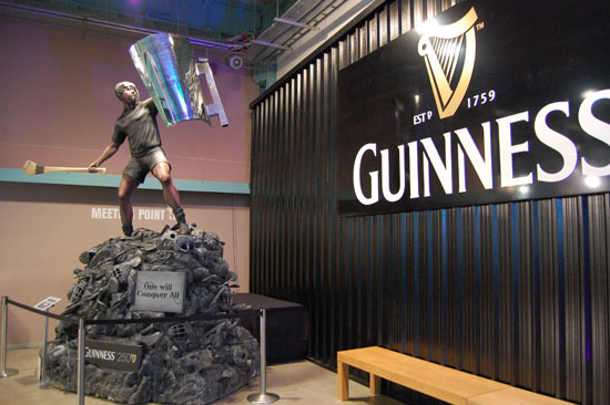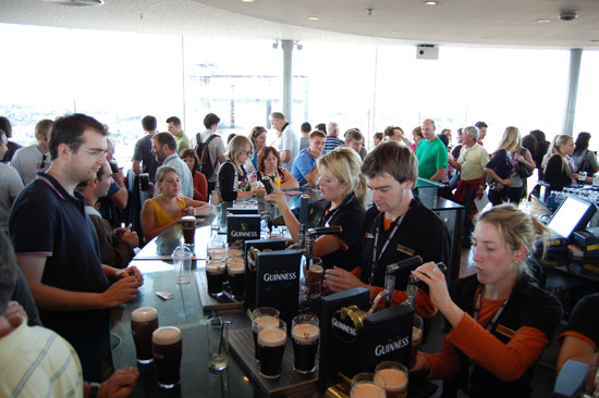 Die Arbeitsprozesse der Bierherstellung wurden erklärt. Das interessierte mich nicht so sehr, war aber gut gemacht. Alle Aspekte der Guiness Story wurde dargestellt. Eine Probekostung mal zwischendrin. Ganz am Ende war die Gravity Bar, mein eigentliches Ziel. Von dort oben sieht man ganz Dublin. Der letzte Ausschank war 17:30 und ich hatte genug Zeit für ein frisches Guiness, was im Eintrittspreis inbegriffen war. Das schmeckt schon anders, als in Deutschland. Die vielen Leute da oben waren wenig amused, als der frühere Schluss angekündigt wurde.