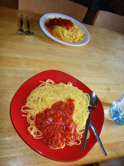 Ich traf den Deutschen, wir machten was aus. Ich hatte Spaghetti, er kaufte eine Lasagne. Die Spaghetti waren die Vorspeise mit extra Soße aus der Free Food Abteilung. Dann füllte sich die Küche rasend schnell mit allerhand Leuten. Die kamen mit vielen Pizzen an, belegten diese und brauchten entsprechend auch den Ofen. Meine restlichen Spaghetti waren schnell fertig, bis ein Platz im Ofen für die Lasagne frei wurde, dauerte es. Zwischendurch wurde uns von der Pizza ein Stück angeboten. Sehr gut, sogar mit Tabasco.