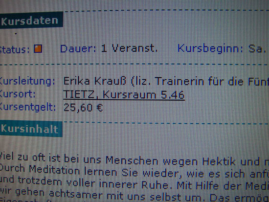 Ich hatte mir ’nen Wecker gestellt, schlef dann aber doch wieder zu lange. Augen auf um 9:40 und Stress. Schnell was gefrühstückt und mit dem Auto in die Stadt. Ich wollte eine Veranstaltung in der Vlkshochschulte „das tietz“ zu Meditationsformen mitmachen. Interessiert mich momentan.