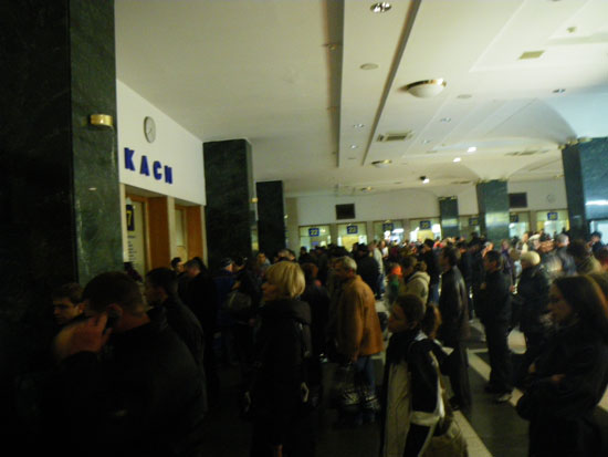 Nun hatte ich eine Menge Zeit – so über 3 Stunden. Darußen regnete es aber ich holte mir was zu essen. In der Ukraine hatte ich mangels Sprachkenntnissen nicht so viel Futter in den vergangenen Tagen. In einer Halle war die Luft extrem verbraucht. In einer anderen setzte ich mich auf meinen Rucksack und spielte iPod Touch. Mini Gore rockt noch immer.