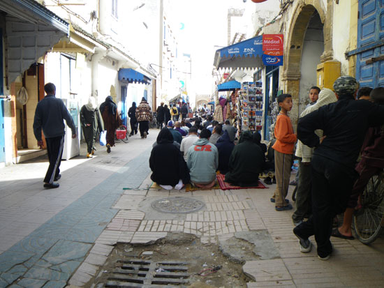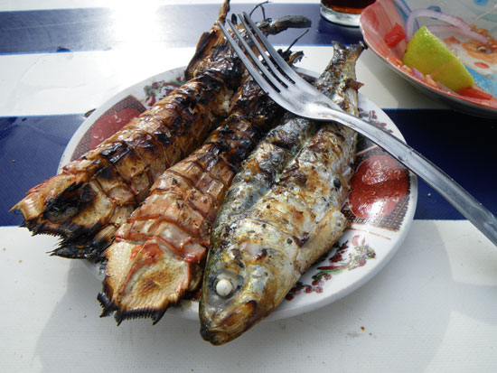 Nachmittags aß ich frischen Fisch direkt am Hafen und hatte Bedenken, dass ich über’n Tisch gezogen werde. War OK – 80 MAD + 10 Trinkgeld, weil es gut schmeckte und gegrillt war. Dann ging ich zu einem Friseur. Der nahm 50 MAD (4 EUR) und ich gab 20 Trinkgeld. So genau mit ’nem Rasiermesser und Ausbürsten von Haaren nimmt es in Deutschland kein Friseur. Noch immer hatte ich Zeit und kaufte 10 Postkarten und Briefmarken (98 MAD), die ich auf dre Dachterasse auch schnell schrieb. Die Adressen suchte ich mir unten im Fernsehraum dann ausm Internet und so wurde es 17:30.