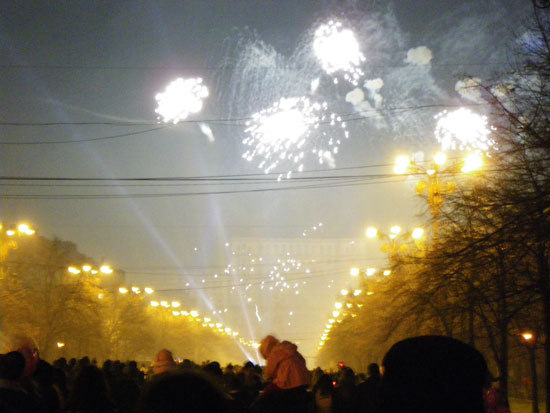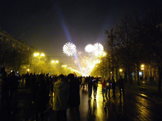 Die Italiener gingen alleine weg, was ich nicht so schlimm fand. Ein Pärchen aus den Niederlanden war erst im Hostel, dann kam noch ein Amerikaner und ein Deutscher hinzu. Die beiden kamen mit ihrem taxi uns nicht hinterher und so war ich mit den Holländern alleine. Wir gingen was essen und die Zeit wurde knapp. Am schnellsten ging Pizza. Das Mädel hatte Pech, denn eine Kerzenleuchter über ihrem Kopf ließ auf einmal Wachs fließen – auf Haar und Kleid. Ich machte dann bissel hin aber sie kam mit hohen Absätzen nicht so schnell hinterher. Wir schafften es dennoch bis Punkt 12 auf den urinii Boulevard. Mit einem Pacukenschlag ging das Jahr zu Ende und dann lief gut 20′ Feuerwerk. Nichts gigantisches aber doch ganz nett.