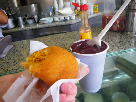 Durst und Hunger: ich ging in ein etwas schäbiges Restaurant und bestellte mir ein Steak mit Pommes und Reis. Ein Orangensaft, dann noch einer und dann noch einer. Das kostete insgesamt 30 Reais (12€) wobei ich mir etwas weniger ausgerechnet hatte. Bauchschmerzen aus irgend’nem Grund. Kaufte noc Wasser und Äpfel und nochmal Acai für den Weg.
