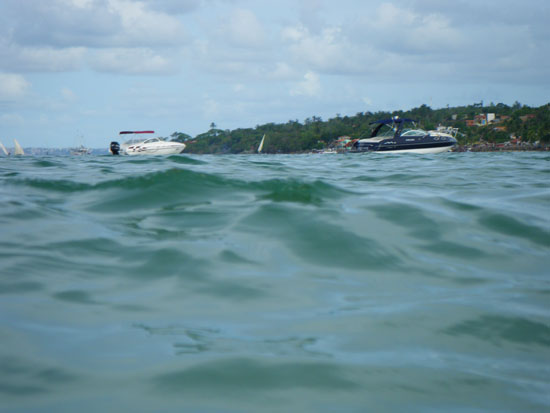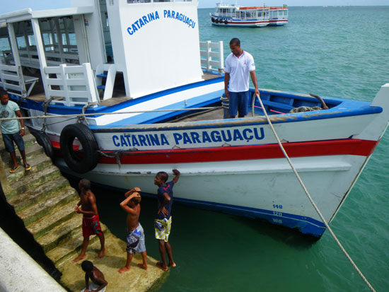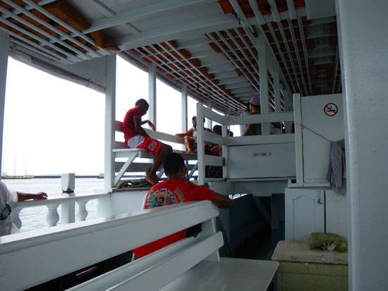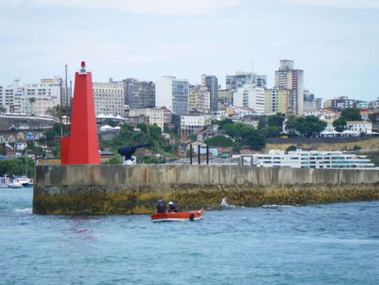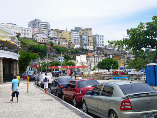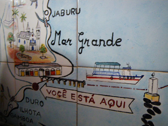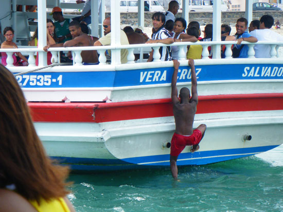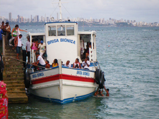 Unser Ziel des Tages war die Insel Itaparica. Ich hatte damit am Montag gerechnet aber jetzt ging’s los. Ein Engländer (geschätzt über 50) machte die Gruppe die 6er Gruppe komplett. Wir gingen zuerst in etwas die falsche Richtung, warteten etwas auf den Bus. Dann ging’s erst mal nach Pelorinho und mit dem Aufzug nach unten zum Hafen. Das Ticket auf die Inset für R$ 4.40 und Start in Kürze – 13:30.