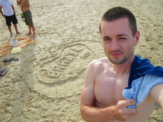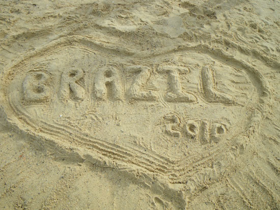 Um 4 dann ging ich in’s Wasser – wie immer super! Die nette Engländerin aus Zypern hatte „Brazil 2010“ in Sand gebaut. Ich machte auch ein paar Photos von den 3 hüpfenden Mädels mit der High-Speed Photo-Funktion.