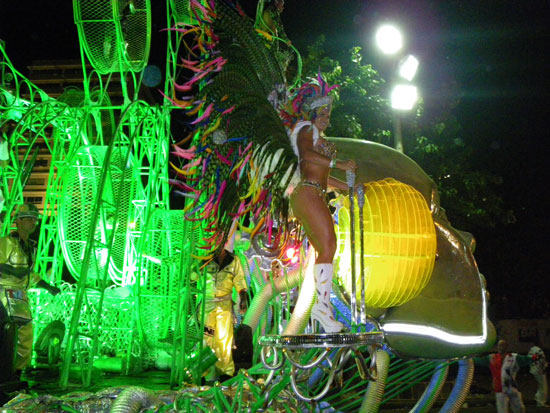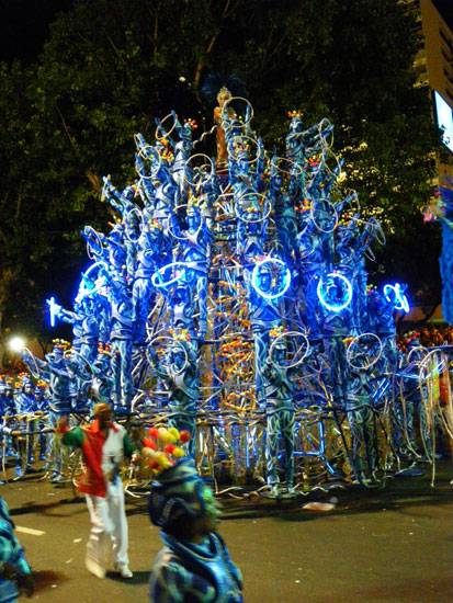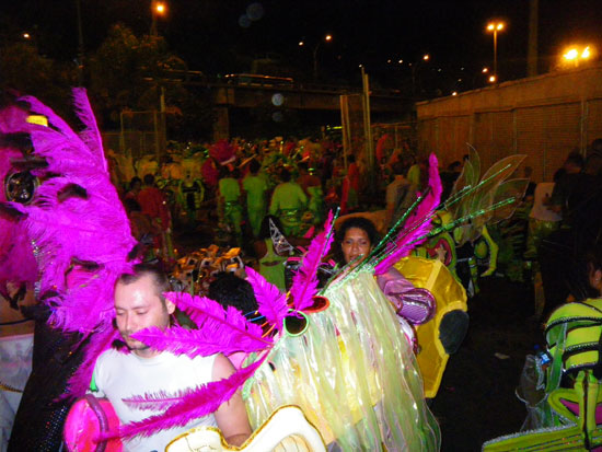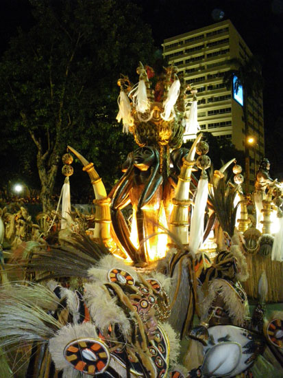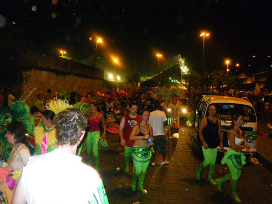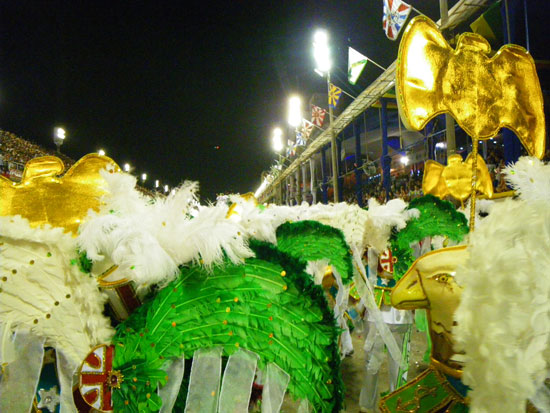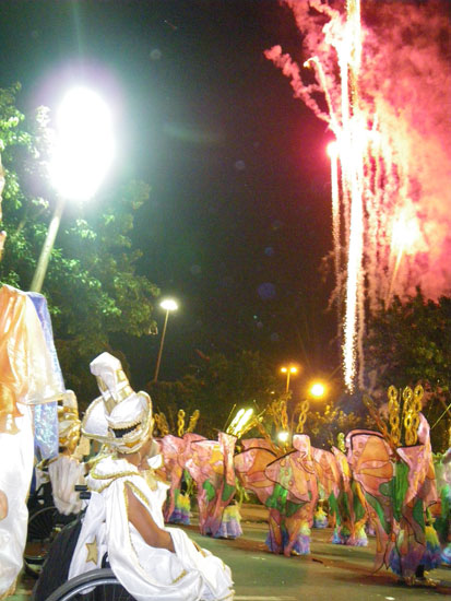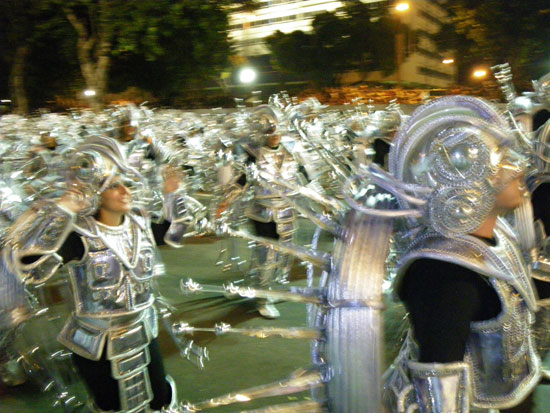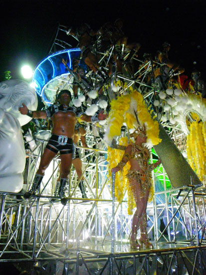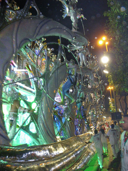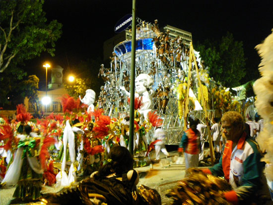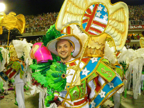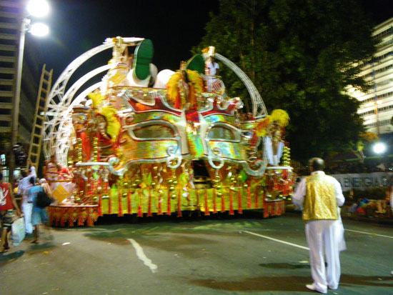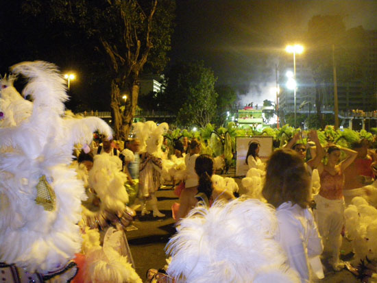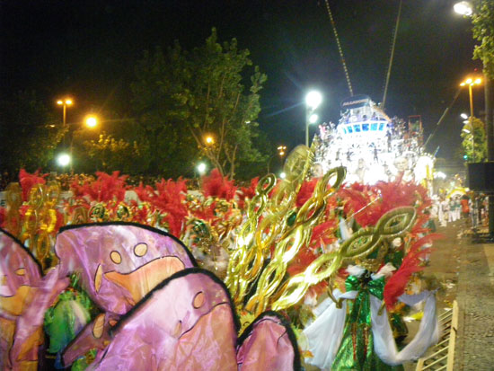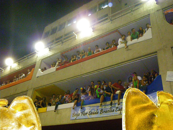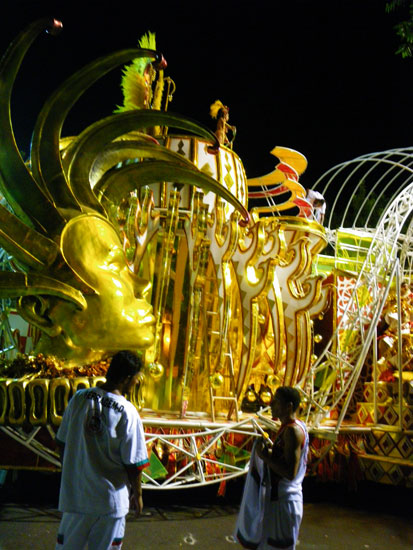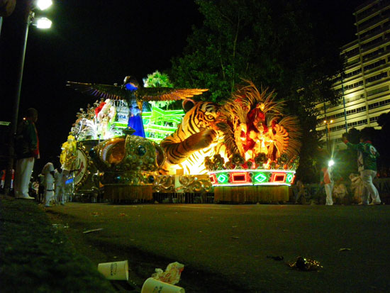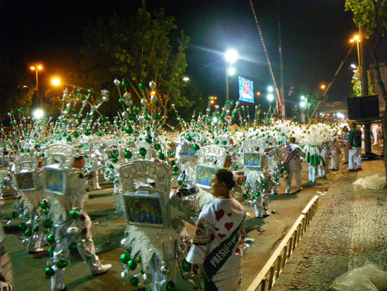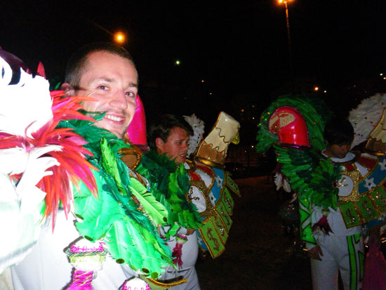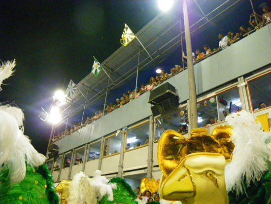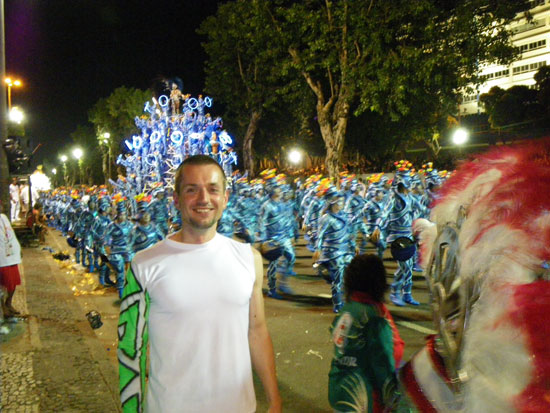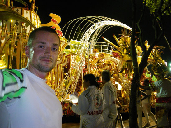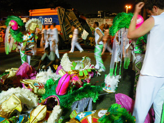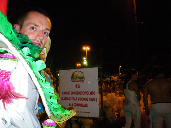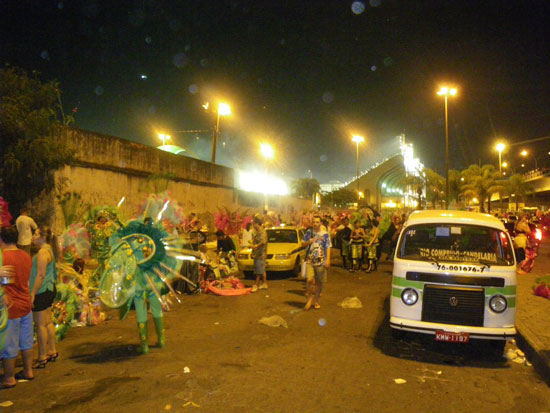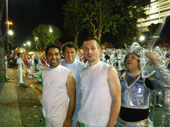Wir waren in der Nähe des Sambadroms, mussten wieder warten, bis alles zusammen kamen. Es wurde 23:00. Dann schleppten wir die ganzen Sachen auf die Startpiste vor dem Sambadrome. Hitze, Schweiß – das war nicht einfach. Eine Schule war vor uns dran an da sah ich die wahnsinnig aufwändigen Paradewagen mit den hübschesten Menschen drauf. Fantasievolle Kostüme und eine gute Stimmung. Ich holte mir ’nen Burger und schaute mir die Show an. Dann gegen 4 Uhr morgens waren wir dran. Es bracht leichte Hektik auf, die Kostüme ordentlich zusammenzustellen. Wenn man da Teile vergisst, könnte man aussortiert werden. Ganz so extrem, wie einer es sagte, der schon 7 Mal mittanzte, war es dann doch nicht. Ich stopfte eine übrige Hose in den Hut, damit er hielt. Es ging los, Feuerwerk, Jubel. Der Song erklang und wiederholte sich quasi die ganze Zeit. Wir waren wohl ca. 1 Stunde am tanzen in einer Reihe. Die Leute auf den Rängen jubelten und schwangen die Arme. Schon ei cooles Feeling – anonym in der Masse aber ebeb was für ’ne Parade. Man sieht neben den Leuten und der Reihe vor einem nicht viel. Die Parade wurde auch in 3D gefilmt. Das erste Mal, dass ich eine Camera mit 2 Objektiven sah. Samba Samba Samba!