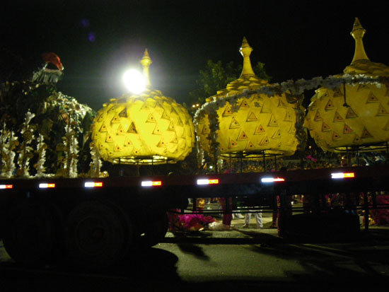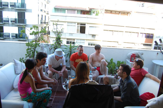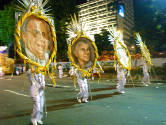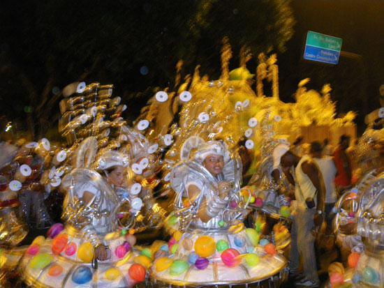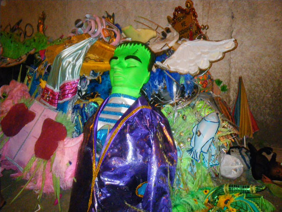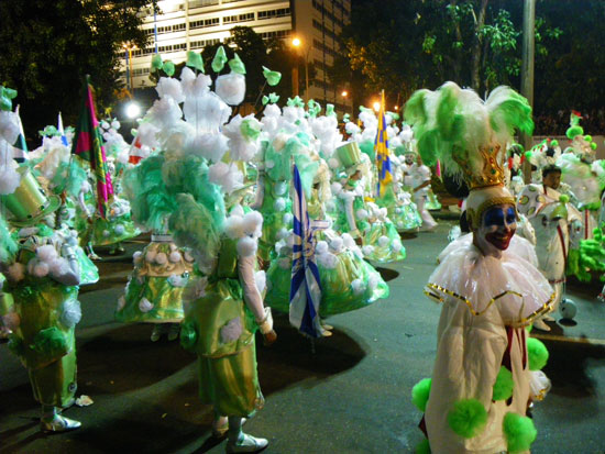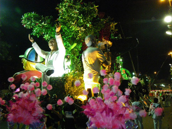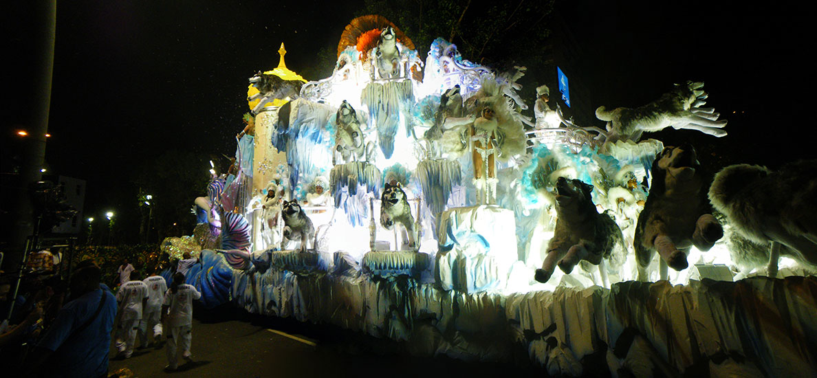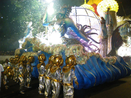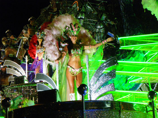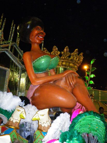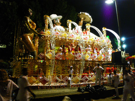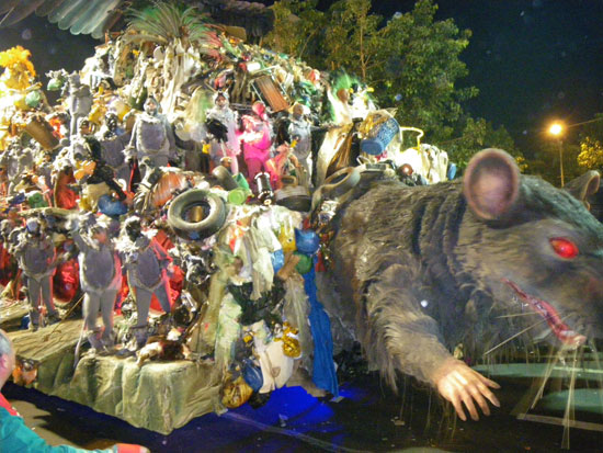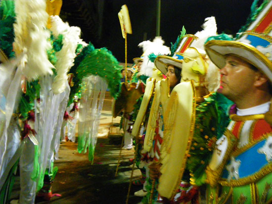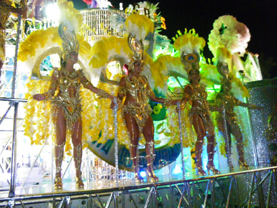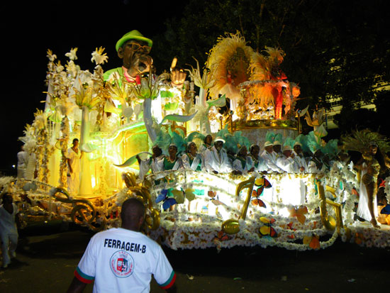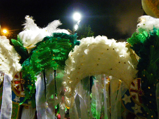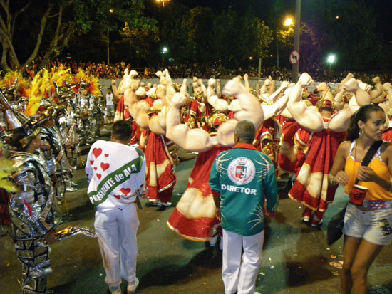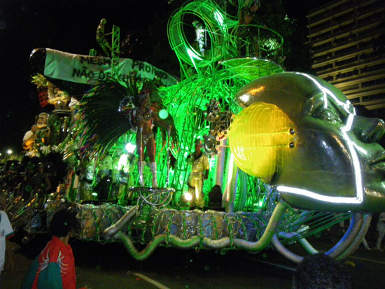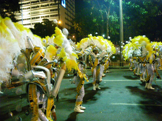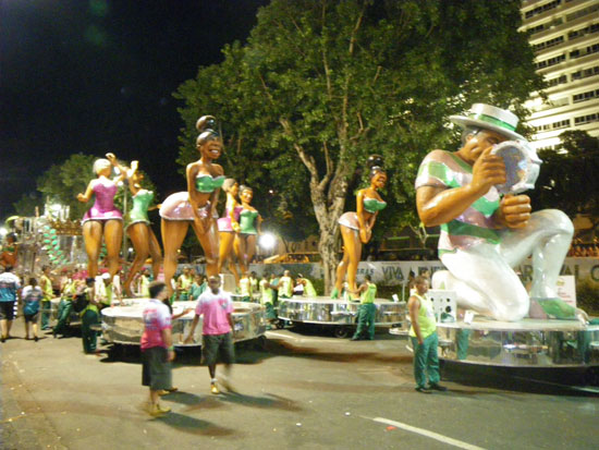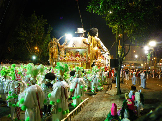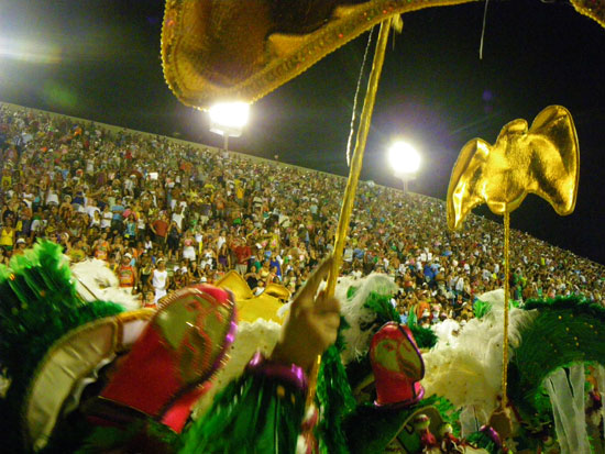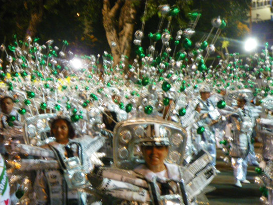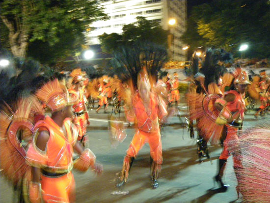 Wir waren in der Nähe des Sambadroms, mussten wieder warten, bis alles zusammen kamen. Es wurde 23:00. Dann schleppten wir die ganzen Sachen auf die Startpiste vor dem Sambadrome. Hitze, Schweiß – das war nicht einfach. Eine Schule war vor uns dran an da sah ich die wahnsinnig aufwändigen Paradewagen mit den hübschesten Menschen drauf. Fantasievolle Kostüme und eine gute Stimmung. Ich holte mir ’nen Burger und schaute mir die Show an. Dann gegen 4 Uhr morgens waren wir dran. Es bracht leichte Hektik auf, die Kostüme ordentlich zusammenzustellen. Wenn man da Teile vergisst, könnte man aussortiert werden. Ganz so extrem, wie einer es sagte, der schon 7 Mal mittanzte, war es dann doch nicht. Ich stopfte eine übrige Hose in den Hut, damit er hielt. Es ging los, Feuerwerk, Jubel. Der Song erklang und wiederholte sich quasi die ganze Zeit. Wir waren wohl ca. 1 Stunde am tanzen in einer Reihe. Die Leute auf den Rängen jubelten und schwangen die Arme. Schon ei cooles Feeling – anonym in der Masse aber ebeb was für ’ne Parade. Man sieht neben den Leuten und der Reihe vor einem nicht viel. Die Parade wurde auch in 3D gefilmt. Das erste Mal, dass ich eine Camera mit 2 Objektiven sah. Samba Samba Samba!