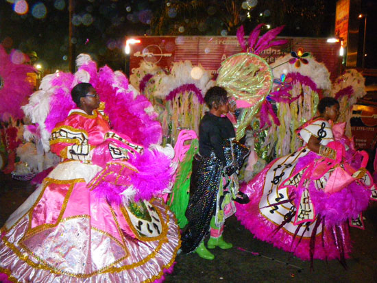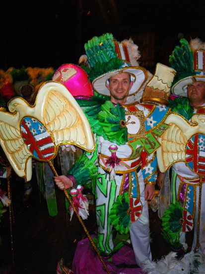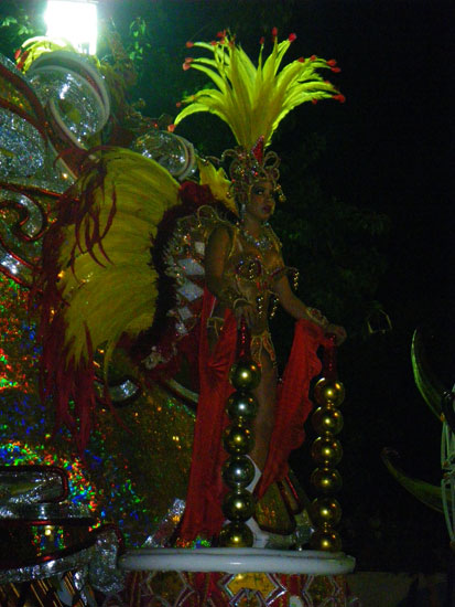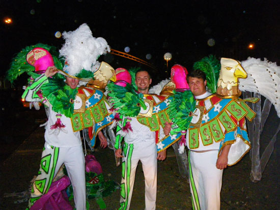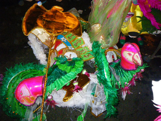 Dann ging’s los: Carnaval. Wir hatten die Kostüme schon da, ein paar mussten sie noch abholen. Für $500 pro Stück ist das ein teurer Spaß aber eben wohl nur ein Mal im Leben. 4-5 Taxis brauchten wir für all das. Extrem große Kostüme mit einem Adler auf der einen und einem Papagei auf der anderen Seite – dazu noch ein gigantischer Hut, der zu groß bemessen war. Er rutschte auf die Schultern und man war im Dunkeln. Mehr als 2 Leute + Kostüme passten nicht rein.