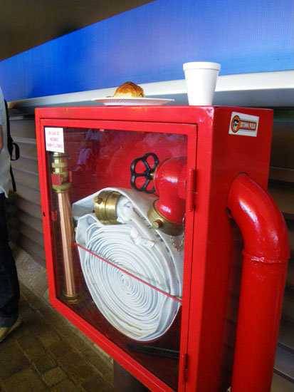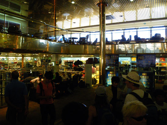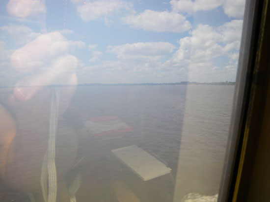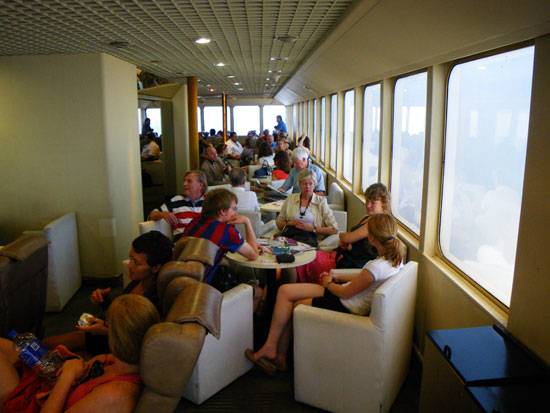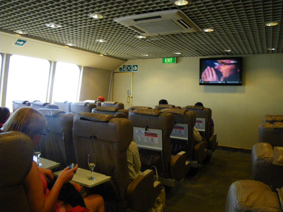 Wir nahmen uns ein Taxi und waren trotz Großdemonstration relativ fix dort. Die Economy-Tickets waren angeblich alle aus – nur noch First Class. Die Bezahlung war wieder woanders als am Ticketschalter. Am ende paste es – ca. 240 (€46). Ich holte mir ein kleines Frühstück und dann ging’s los. Schampus für die FirstClass Gäste und recht bequeme Sitze. Das Schiff war schnell unterwegs. Wohl aus diesem Grund konnte man icht aufs Promenadendeck. Durch die Milchglasscheiben war nicht viel zu sehen.