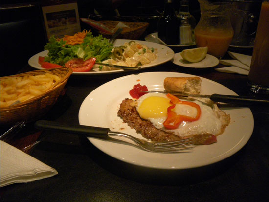 Im Zimmer waren viele Motten. Ein paar fing ich ein und beförderte die vor die Tür. Ich selbst kam erst zum Abendessen wieder vor die Tür. Bei Don Pepperne holte ich ein Chivito al Plato mit Tuti Fruti Saft. Sehr gut und reichlich – 333 Pesos, wobei die Bedienung (40 Pesos) auf die Rechnung kommt, ich aber noch etwas Kleingeld extra gab. Schon wieder eine Schnappszahl. Die Laune wird langsam besser.