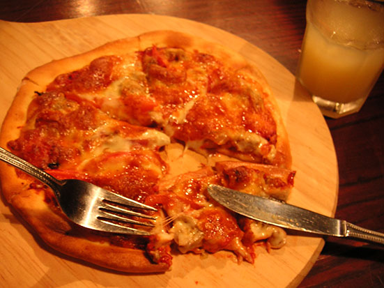 Dann ging ich durch das ungemütliche Wetter Richtung Essen. In einem gemütlichen Pub saßen nur eine Handvoll Leute herum und ich bestellte mir eine „Tandoori“ Pizza – indischer Stil mit Apfelsaft. Die war sehr lecker – bissel klein – aber lecker. Es war inzwischen dunkel geworden und ich ging satt wieder zurück.