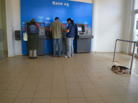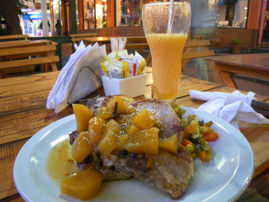 Ich hüpfte in den Pool und ging dann wieder runter in die Stadt, holte meine Wäsche ab (AR$ 32). Die Schuhe wollte ich mit Kleber aus’m Bürobedarfsladen kleben. So bestellte ich mir ein Schweinesteak mit Mango Chutney und versuchte die Sohlen zusammenzukleben. Das klappte nicht, da muss ein Profi ran oder ich kaufe mir neue. Jetzt hatte ich zu viel Geld übrig, hätte eigentlich ein paar Schuhe davon kaufen können .. dachte ich.