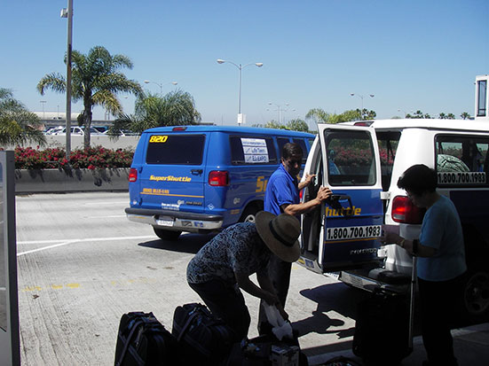 Wieder zurück im Motel buchte ich ein Shuttle zum Flughafen. Wollte mal eine andere Firma nehmen. Express Shuttle wollte $51 — No, thanks. Also wieder das Supershuttle. Per Web ging’s nicht, also angerufen ($24). Die fanden mein Motel nicht. Ich betete die Adresse herunter aber das Hotel war nicht im Computer. Schließlich fand sie es nach der Telefonnummer — war wohl früher ein Holiday Inn. OK, die sollten mich in spätestens 45 Minuten abholen aber das ist zu knapp und sie musste das erst checken. Die ganze Aktion dauerte 15 Minuten — mit dem Handy…
