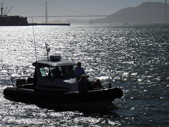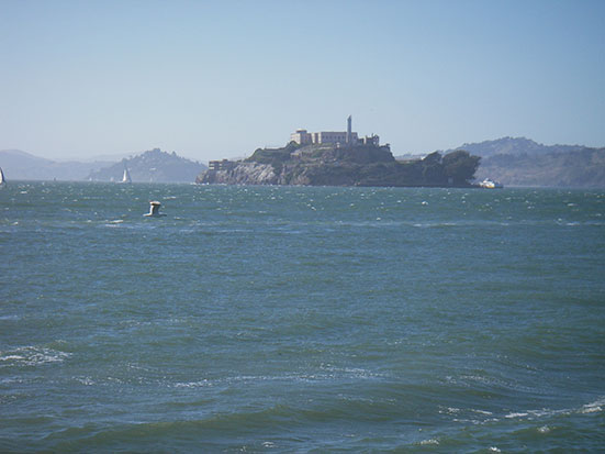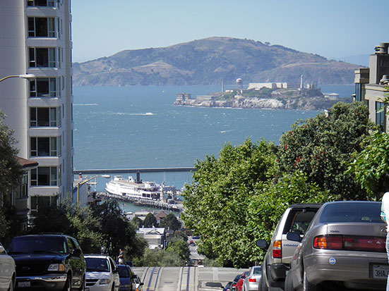 Nach vielleicht 10 Minuten war ich dabei und stellte mich gleich ganz vorn an die Seite. Auf gings los. Ber hoch, vorbei am Union Square. Es stiegen immer noch ein paar Leute zu. Die Fahrt ging lange bis runter zum Wasser. Der Wind wehte, trotz Sonne war’s sehr frisch. Vom Berg oben an der Lombard Street sah man wunderbar Alcatraz.