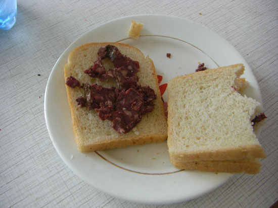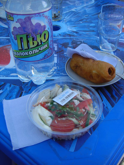 Gegen 3 hatte ich Hunger, ging in einen Imbiss auf der anderen Straßenseite. Da bekam ich ’ne Art Hot Dog, einen Salat und ’ne Limo für RUB 102. Hier ist eben Dorf.
