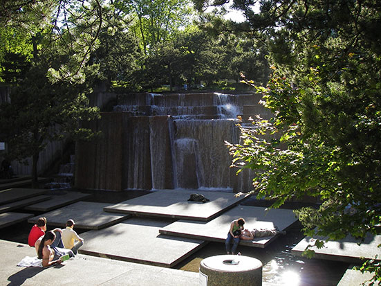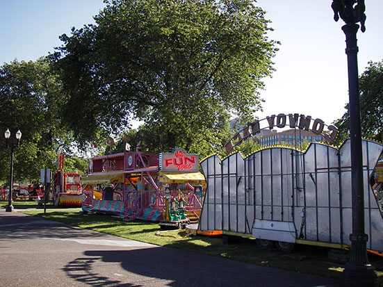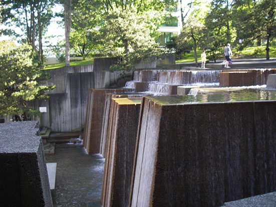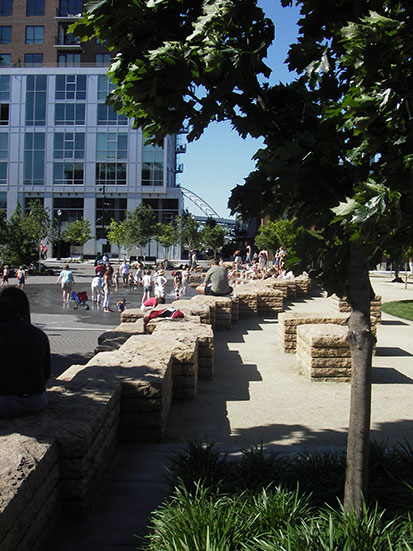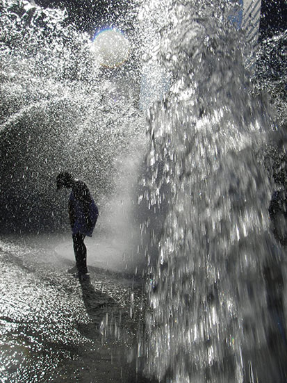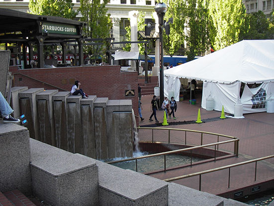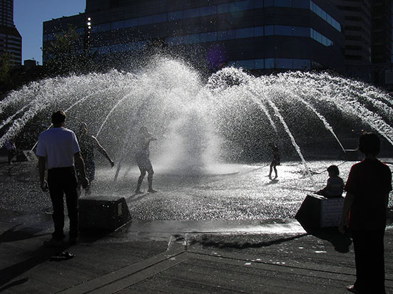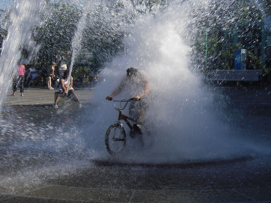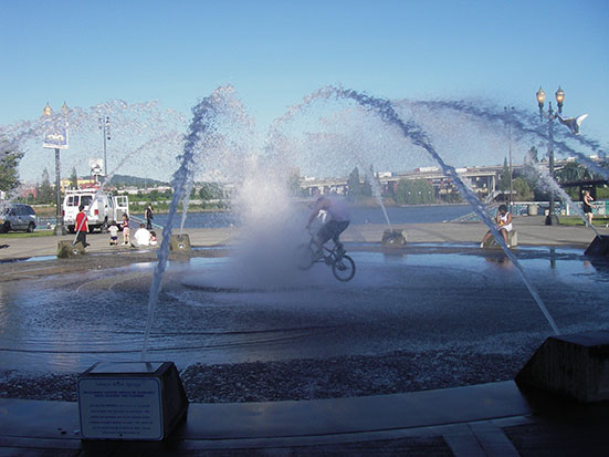 An den „Salmon Street Springs“ rauschte das Wasser durch die Luft. Einige sprangen durch die Fontainen, die sich in der Kreismitte trafen. Da war ordentlich Druck im Wasser. Hätte auch Lust gehabt für ein Soaking und mit wasserdichter Kamera wärs auch locker. Ganz so warm war’s aber jetzt zum Abend nicht mehr, bin am anderen Ende der Stadt, also OK. Mit dem BMX-Rad sprang einer durch die Mitte. Das Fernsehen machte auch ’nen Bericht und ich knippste vor mich hin.