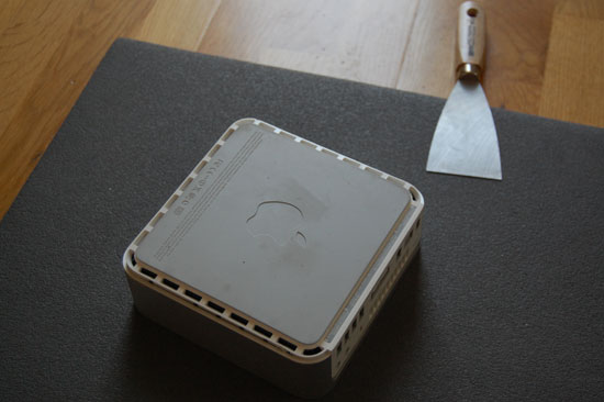 Mir wurde ein Spachtel aus’m Baumarkt mitgebracht. So einen Spachtel brauchte man lt Youtube-Anleitung, um das Gehäuse des Mac mini öffnen zu können. Mit etwas Gewalt klickten tatsächlich die Clips und ich könnte das Gehäuse so aushebeln und öffnen.