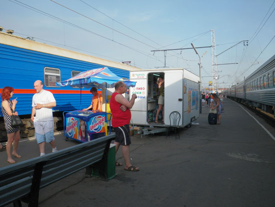 Schon um 1 war ich auf der Kievskaya und dann aufm Bahnhof. Ich schaute die Ticket-Schalter an und sah überall eine lange Schange. Ich wählte einen mit Pause erst 14:00 und wartete eine geschlagene Stunde. Hier muss man viel Zeit mitbringen. Leute kaufen Tickets Wochen oder Monate im Voraus. Weil jeder seinen Pass und Namen angeben muss, dauert das alles. Der Mann vor mir war dann der letzte Kunde. Nebenan ließ mich jemand schnell mein Ticket kaufen. So war ich froh, hatte ein Ticket, kaufte noch was zu essen und ging zum Bahnsteig.