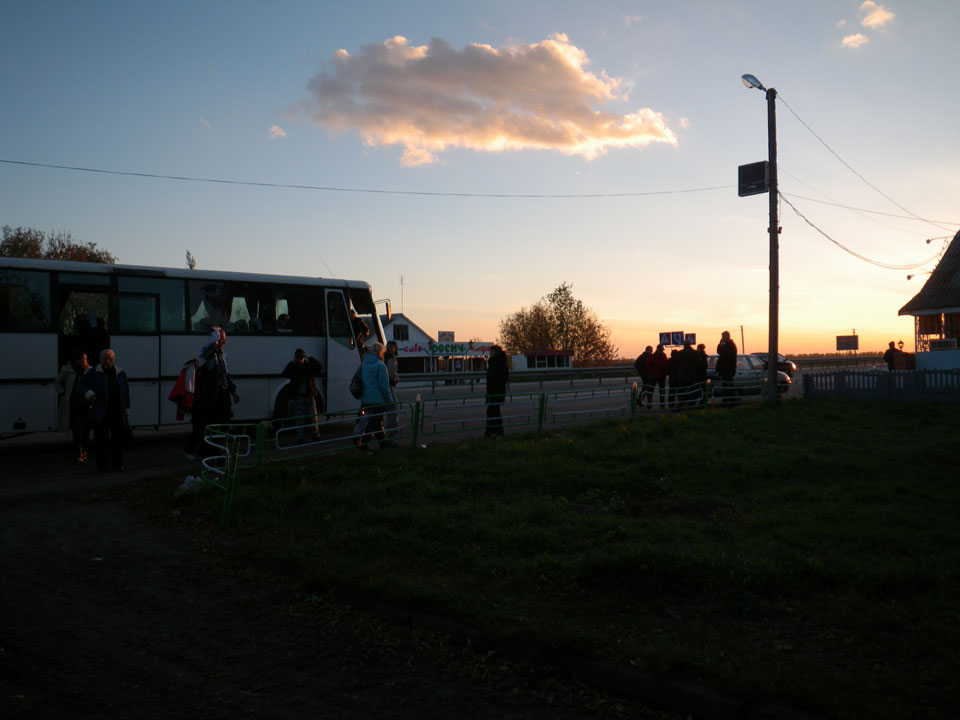 Über 12 Stunden Busfahrt – das merkte ich im Gesäß. Ab und zu gab’s Huckelpiste, hier werden Leute und Busse beansprucht. Einige standen für Stunden im Bus. Dann in der Ukraine Bammel wegen fehlender Immigration-Card. Am Ende Shooters, Bekannte zufällig auch da. Müde. Sage Odessa Hostel ab und verlängere um einen Tag per Zettel. Ich will den Trailer erledigen.