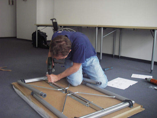 Das Einrichten geht weiter. Ich bin bissel verschnupft. Wir schraubten (ich weniger) die Tische zusammen. Der Akkuschrauber war bissel schwach bei Kraft und Akku. Die Bohrmaschine hatte zu viel Bumms. Letztendlich stehen nun doch die ersten 4 Tische nun da und es ist gut.