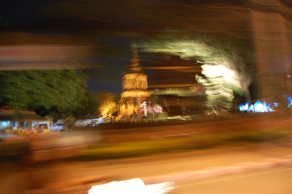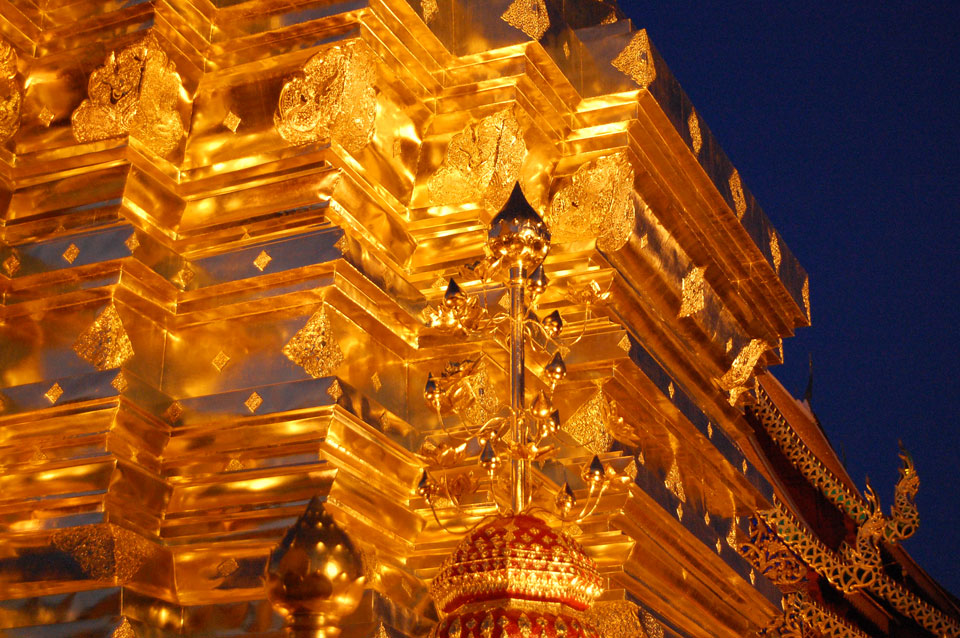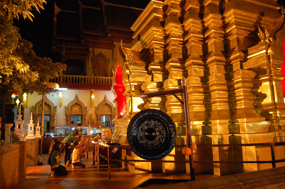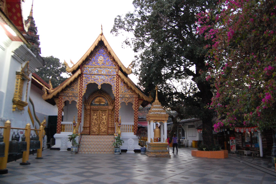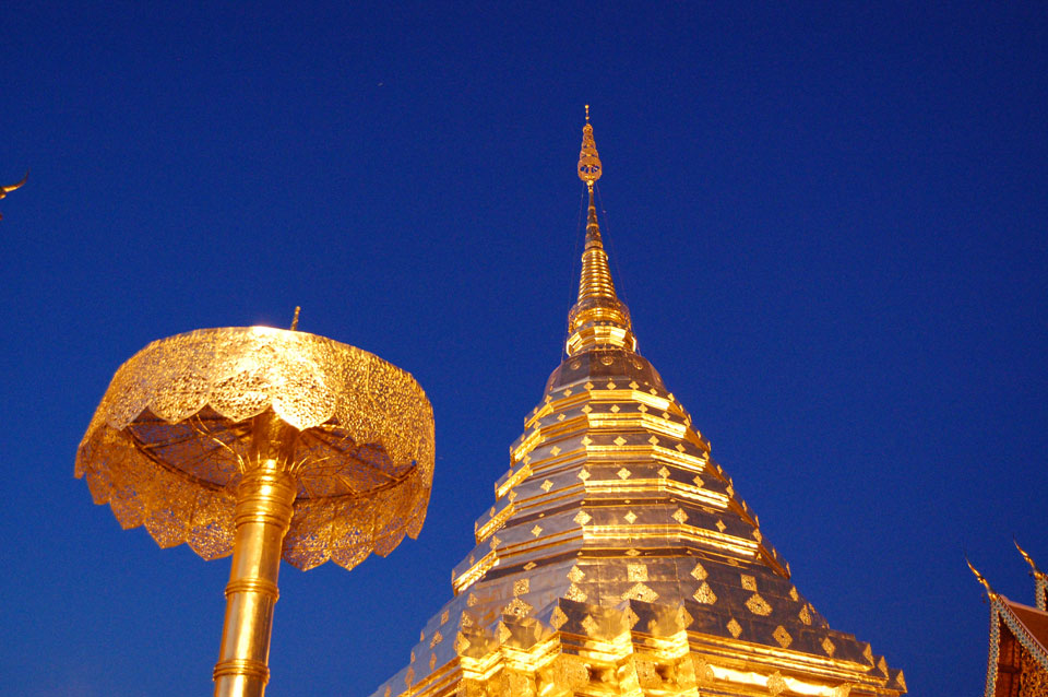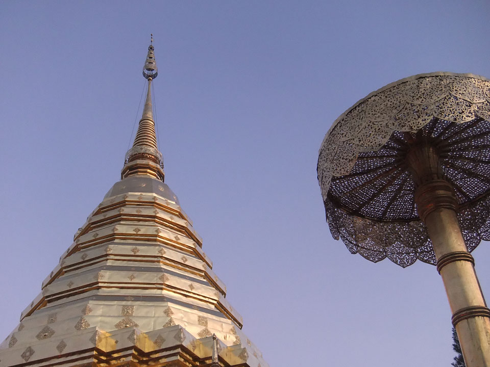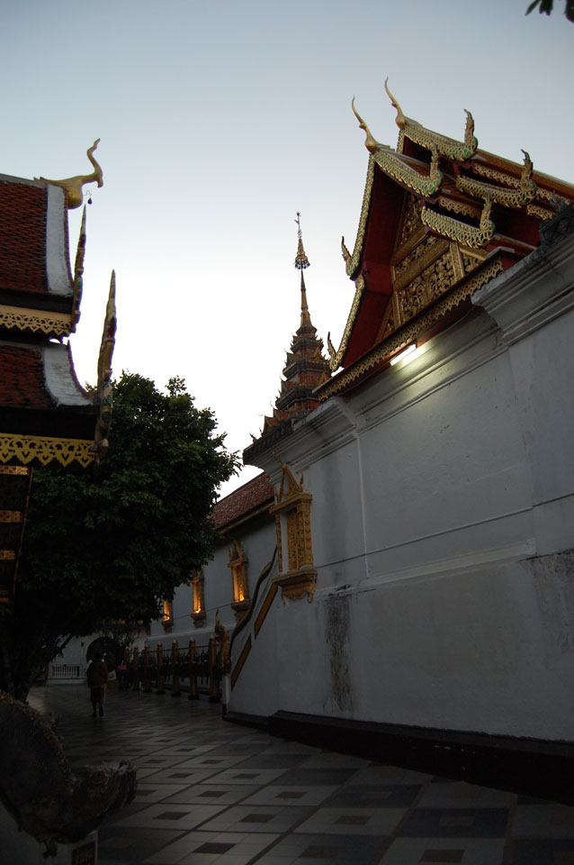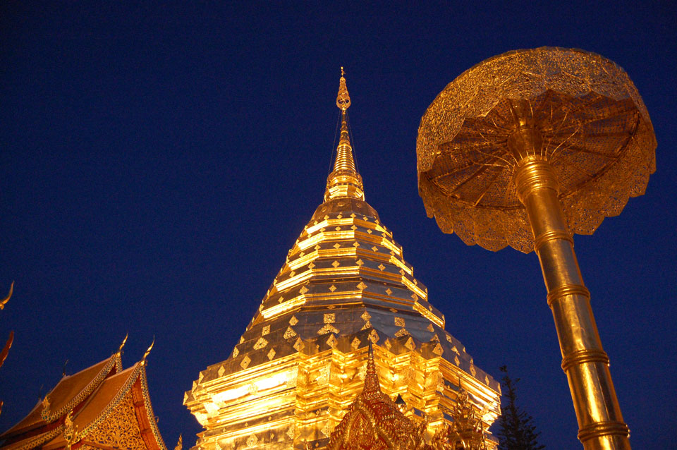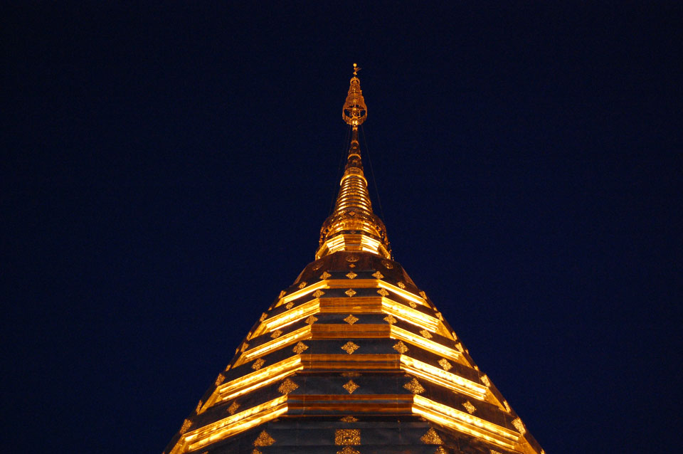 Der Fahrer wollte 300 haben, ich wollte max. 200 zahlen und bei 250 sollte er mich zurück zum Eastgate fahren. So war der Deal und los. Die Straße zum Gipfel schlängelte sich eine Weile hin. Oben schaute mir den Tempel an und war beeindruckt: bisher die schönste Anlage und eine tolle Aussicht auf Chiang Mai. Ich machte aber schnell mit dem Rundgang. Am Ende sangen Mönche noch und das Gold glänzte toll mit den Scheinwerfern drauf. Eine halbe Stunde später war ich wieder unten, wurde zurückgefahren und gabe die vereinbarten THB 250. Ein ganz guter Deal.
