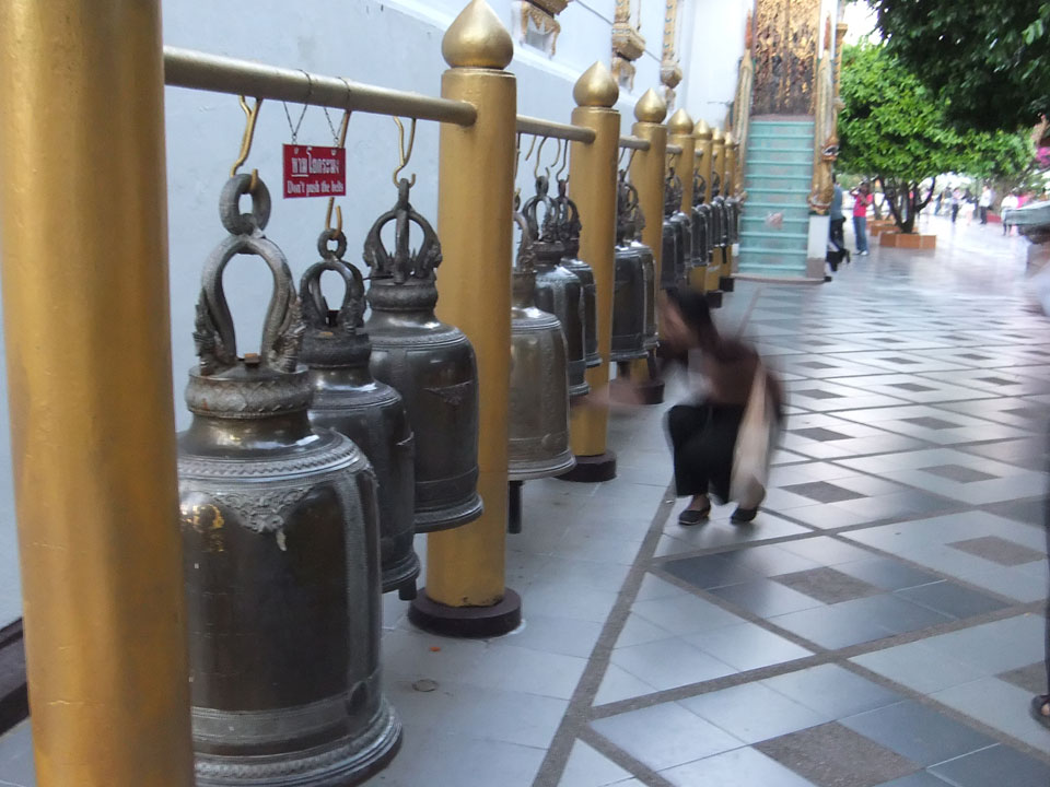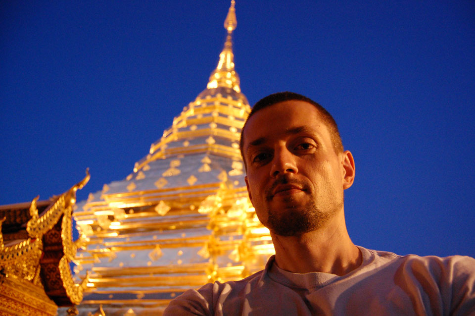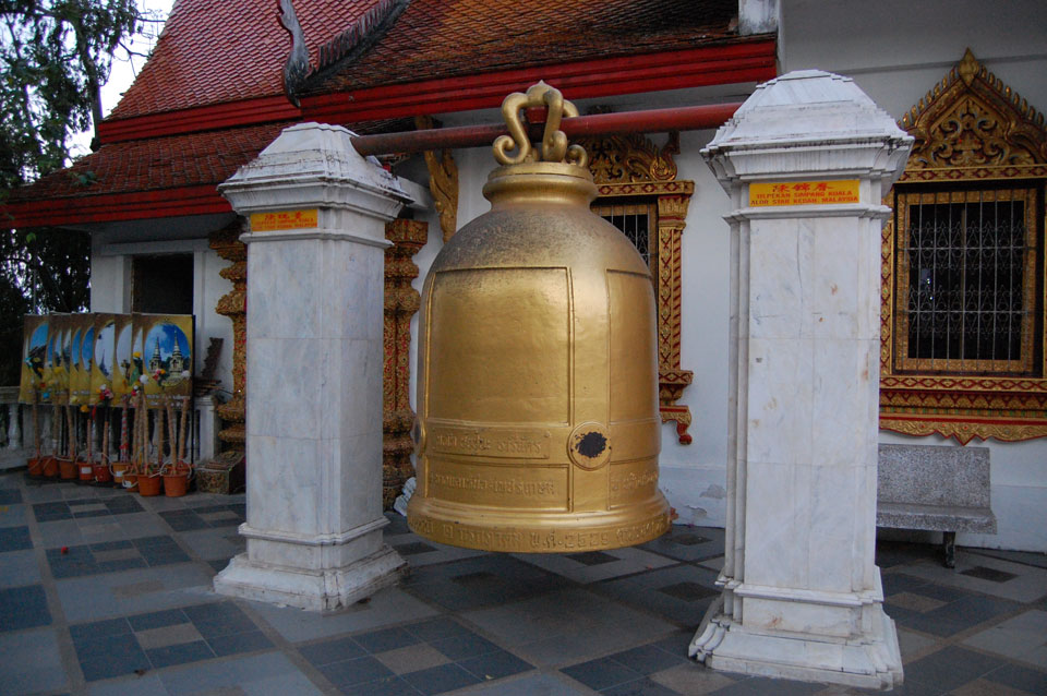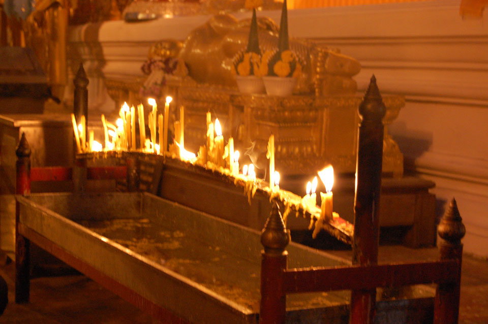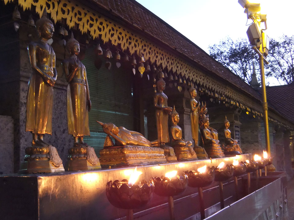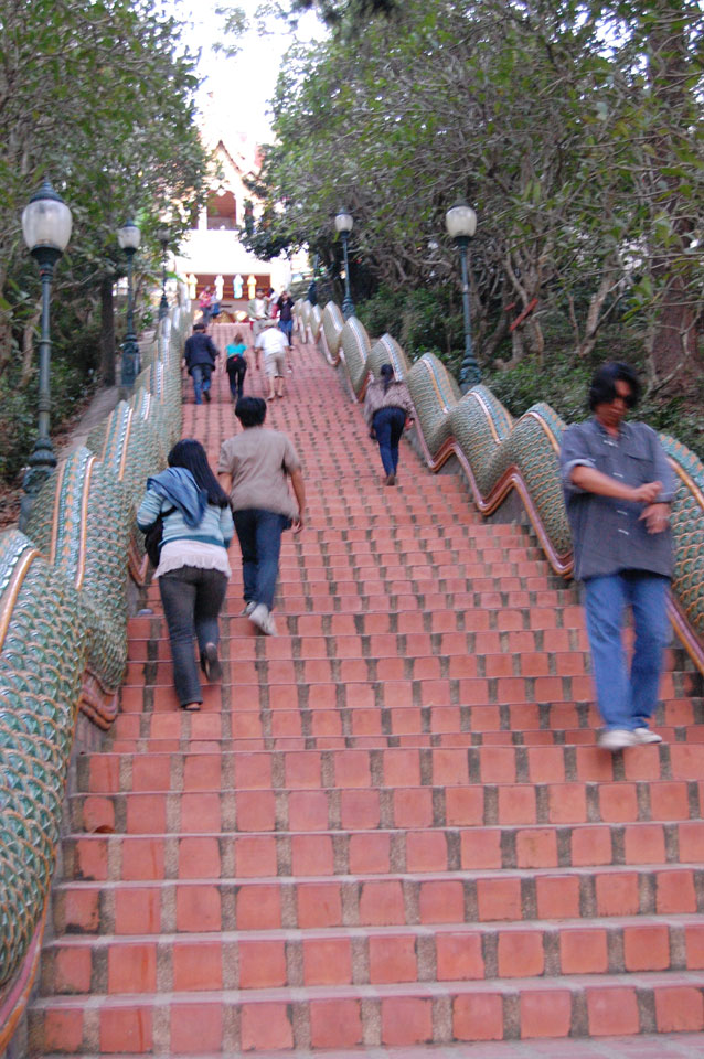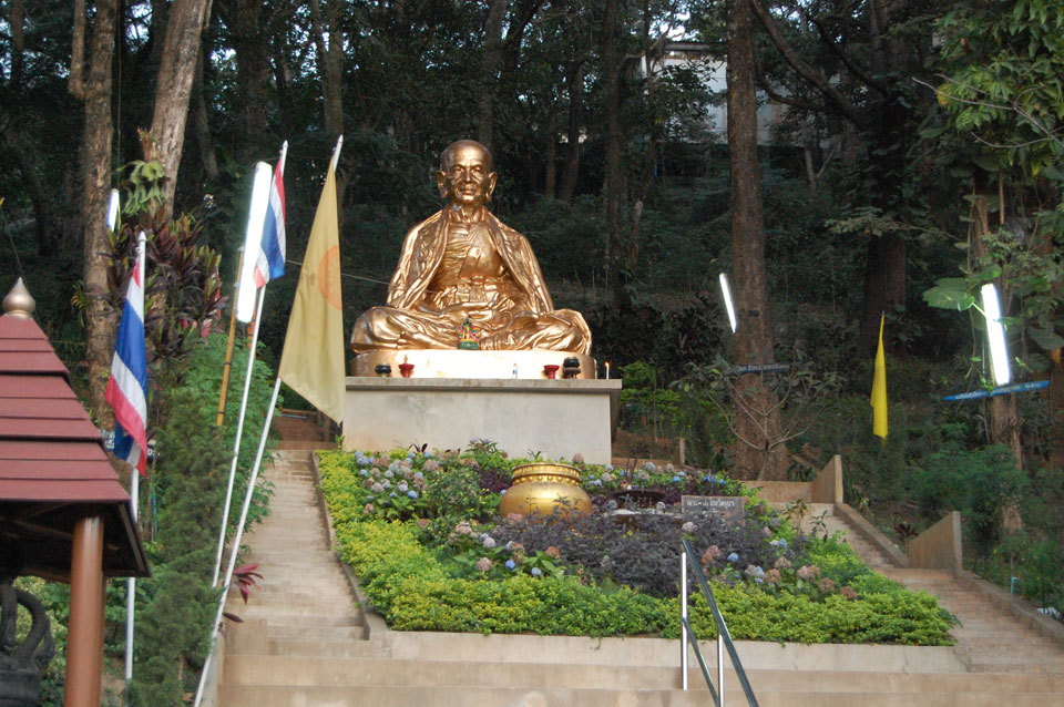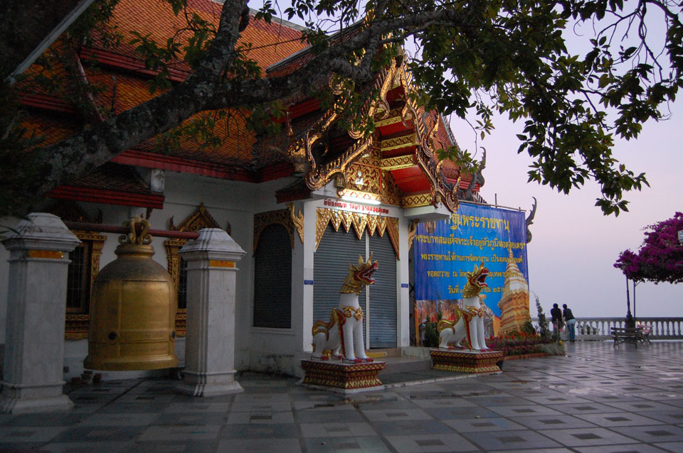 Der Fahrer wollte 300 haben, ich wollte max. 200 zahlen und bei 250 sollte er mich zurück zum Eastgate fahren. So war der Deal und los. Die Straße zum Gipfel schlängelte sich eine Weile hin. Oben schaute mir den Tempel an und war beeindruckt: bisher die schönste Anlage und eine tolle Aussicht auf Chiang Mai. Ich machte aber schnell mit dem Rundgang. Am Ende sangen Mönche noch und das Gold glänzte toll mit den Scheinwerfern drauf. Eine halbe Stunde später war ich wieder unten, wurde zurückgefahren und gabe die vereinbarten THB 250. Ein ganz guter Deal.