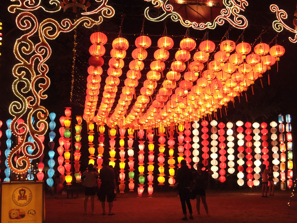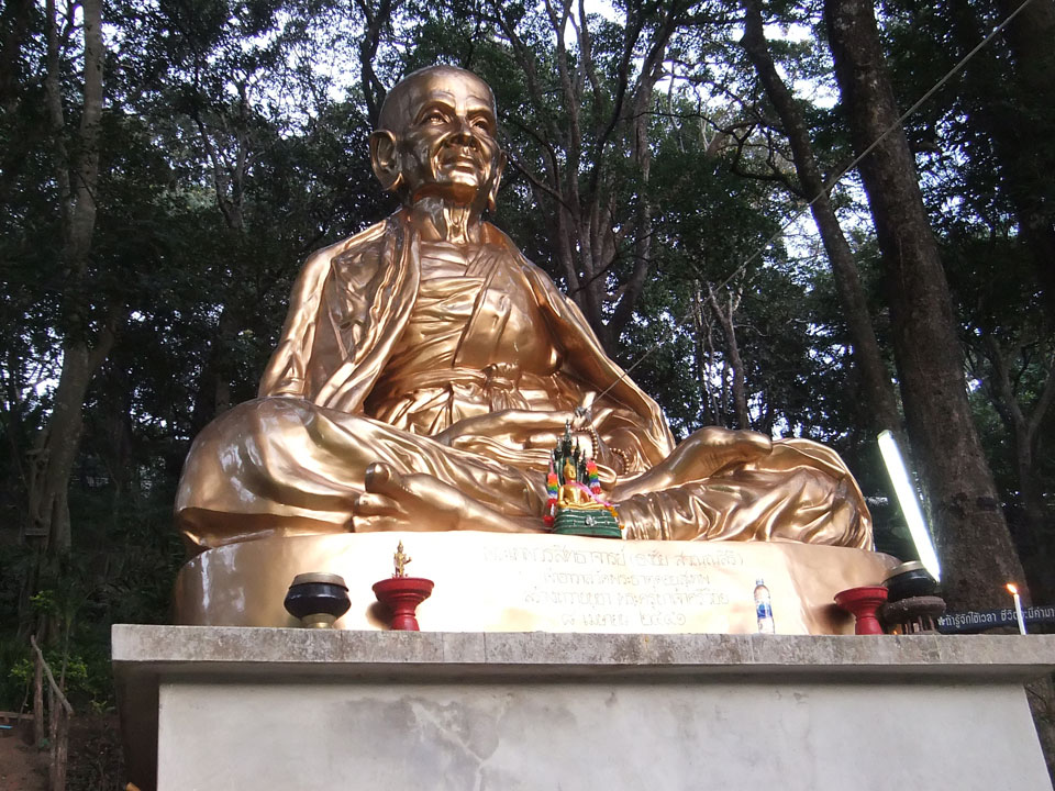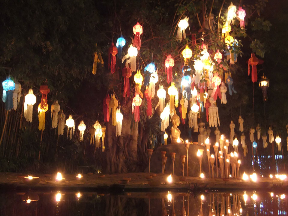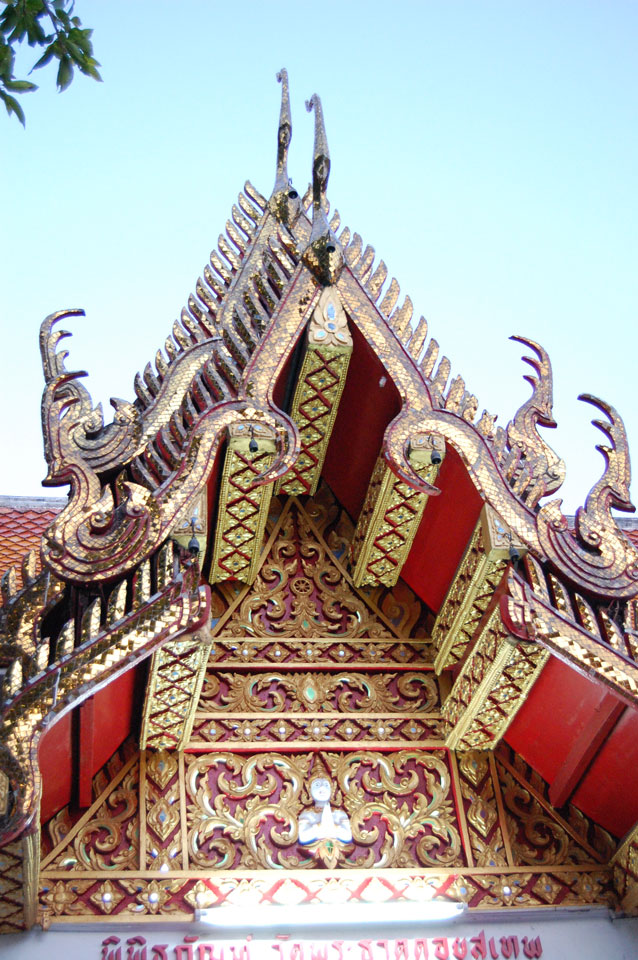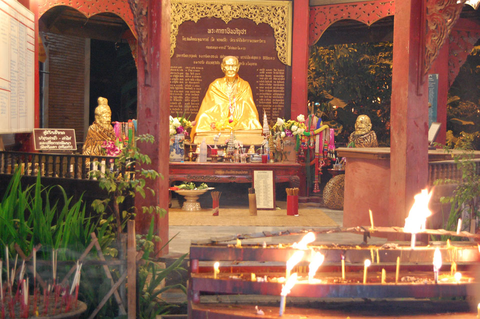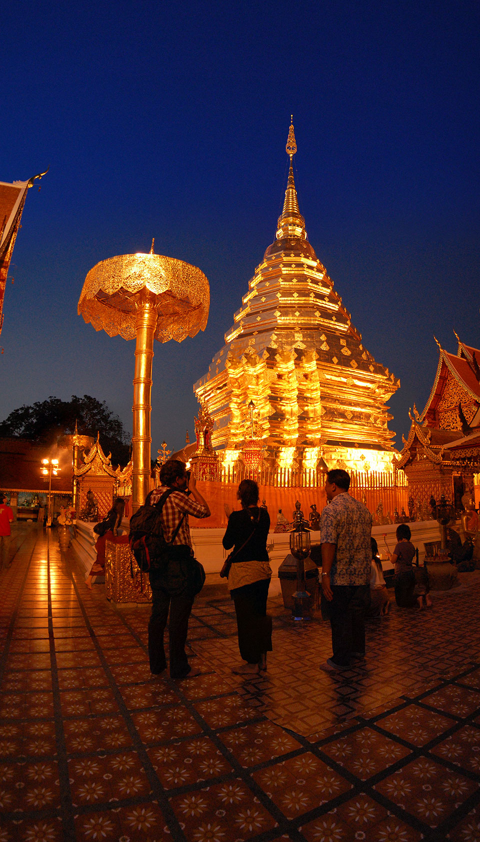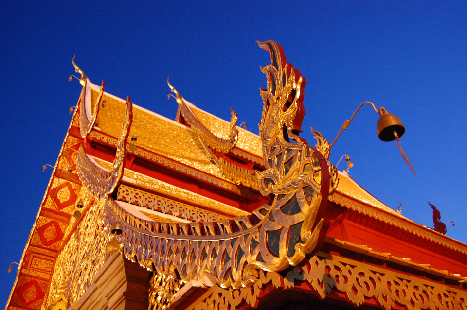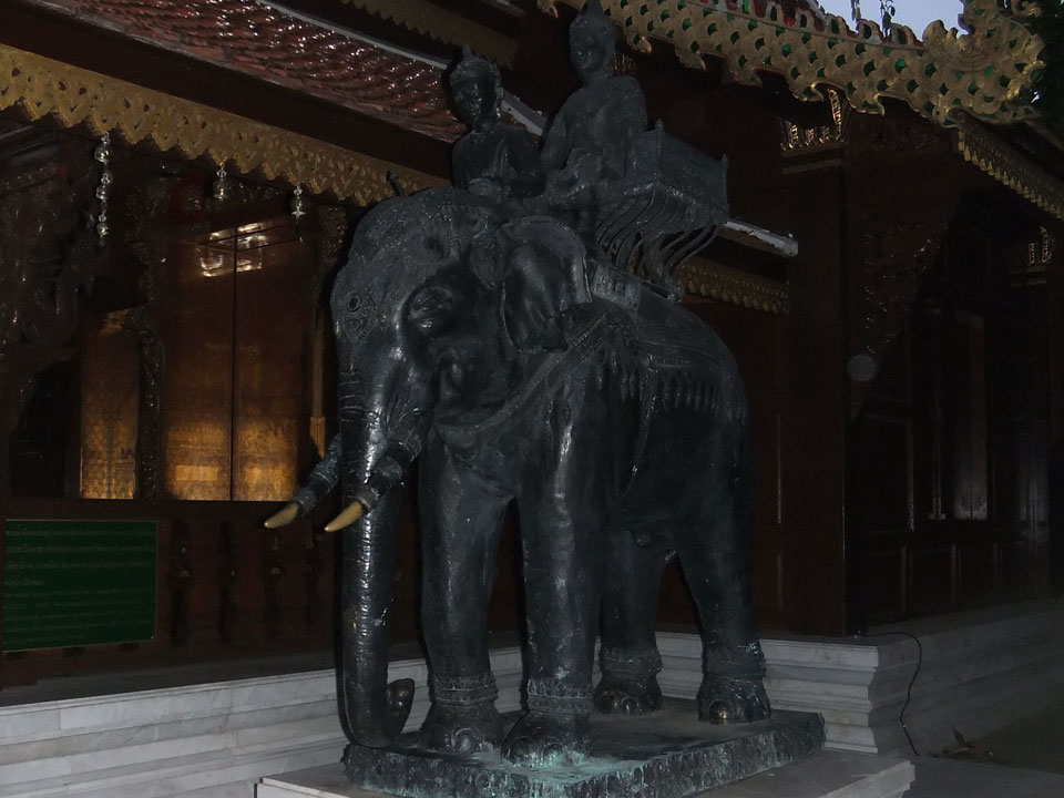 Der Fahrer wollte 300 haben, ich wollte max. 200 zahlen und bei 250 sollte er mich zurück zum Eastgate fahren. So war der Deal und los. Die Straße zum Gipfel schlängelte sich eine Weile hin. Oben schaute mir den Tempel an und war beeindruckt: bisher die schönste Anlage und eine tolle Aussicht auf Chiang Mai. Ich machte aber schnell mit dem Rundgang. Am Ende sangen Mönche noch und das Gold glänzte toll mit den Scheinwerfern drauf. Eine halbe Stunde später war ich wieder unten, wurde zurückgefahren und gabe die vereinbarten THB 250. Ein ganz guter Deal.