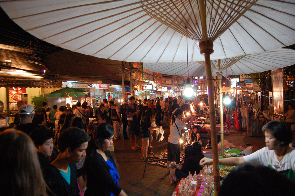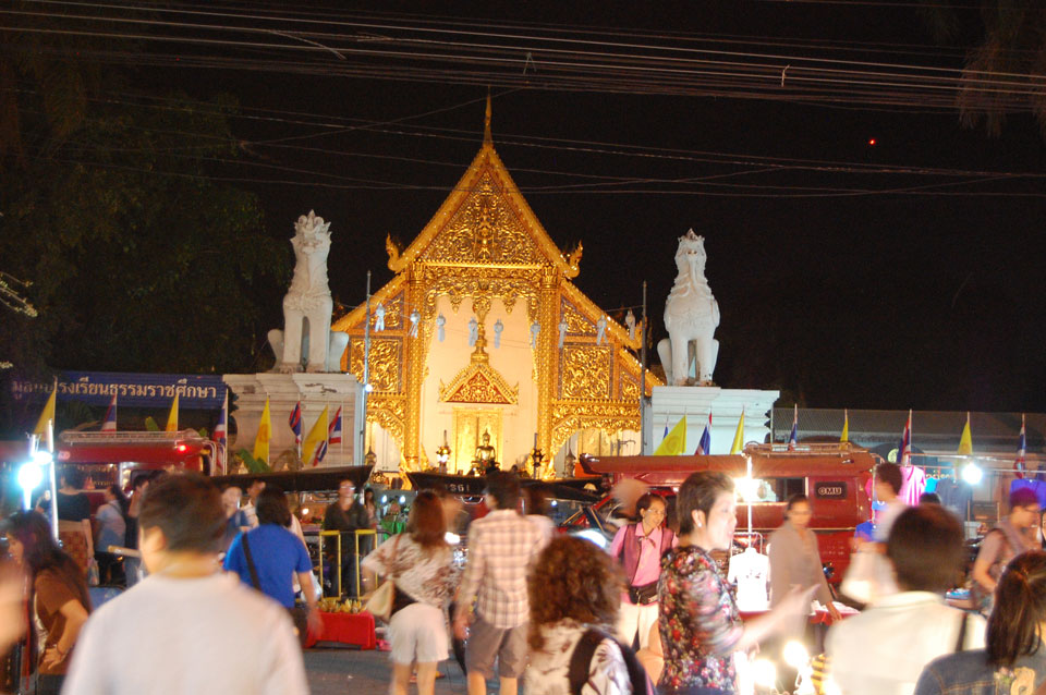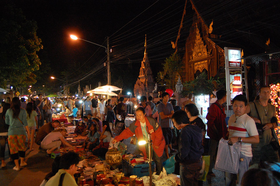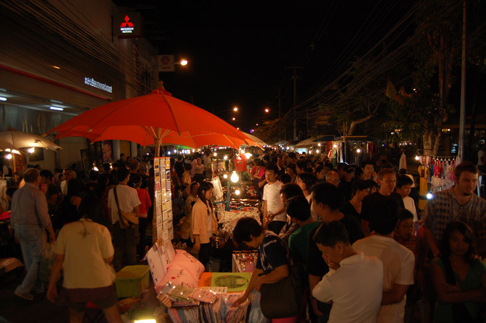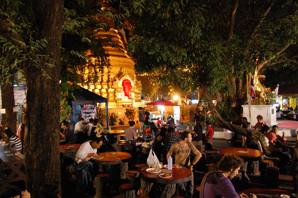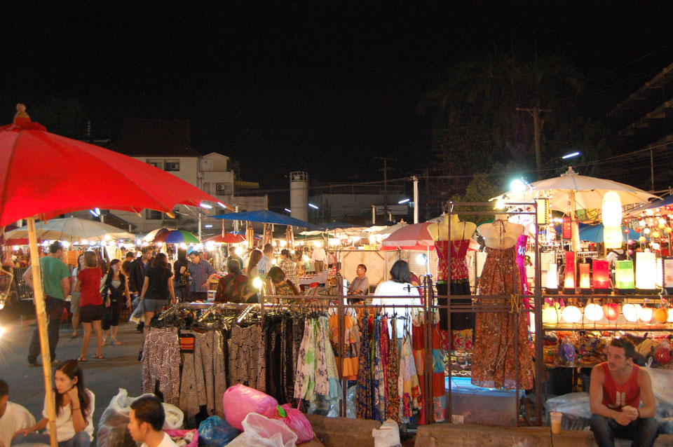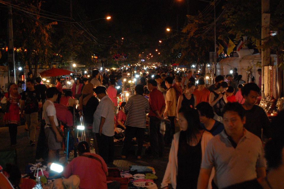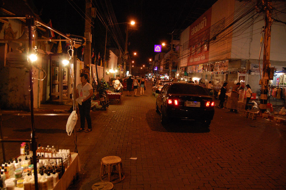 Im Hostel nahm ich neue Batterien auf und ging um 9 wieder raus. Heute zum Sonntag war der Nachtmarkt, eine große Attraktion. Ich ging zum Ost-Tor und war schon am Anfang wieder beeindruckt. So viele Leute und Verkäufer. Unzählige Kleinigkeiten wurden angeboten. Ich kaufte mir ein T-Shirt ohne zu handeln und schlenderte durch die Marktstraßen. Mir gefiel die Atmosphäre super – besser als in Bangkok, die Sachen waren auch ganz nett und spottbillig. Ein Schweinsblut-Curry und ein Gelee und noch ein Spieß – alles lecker.