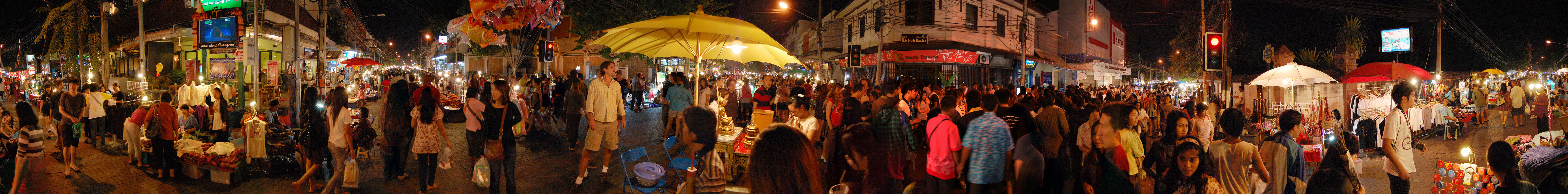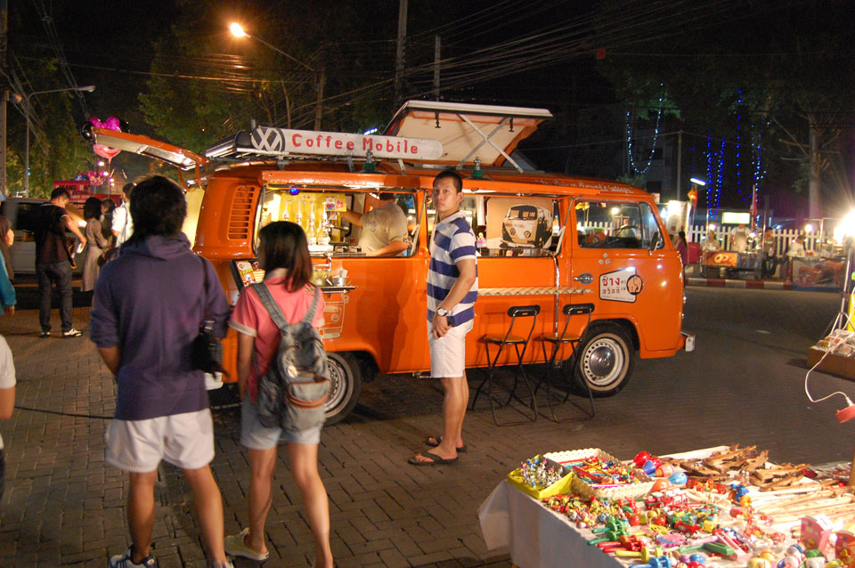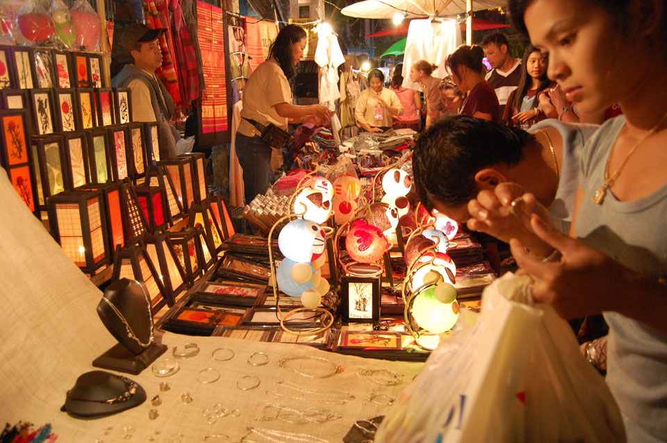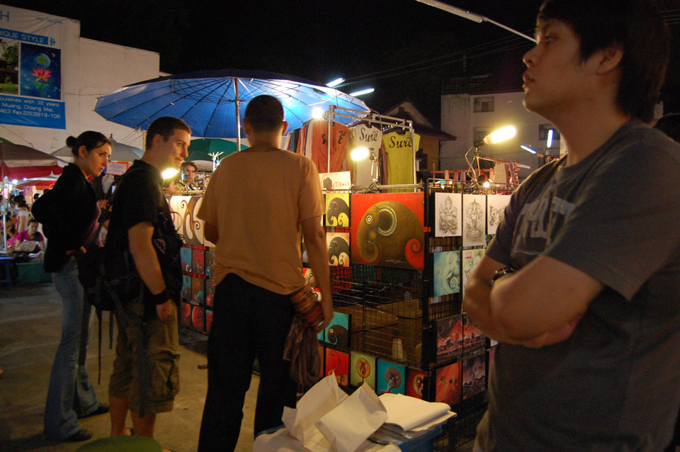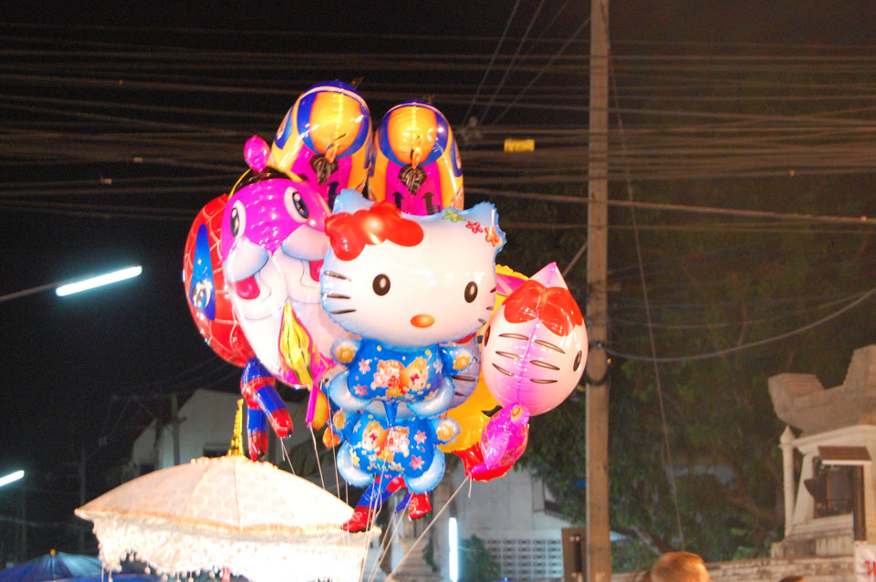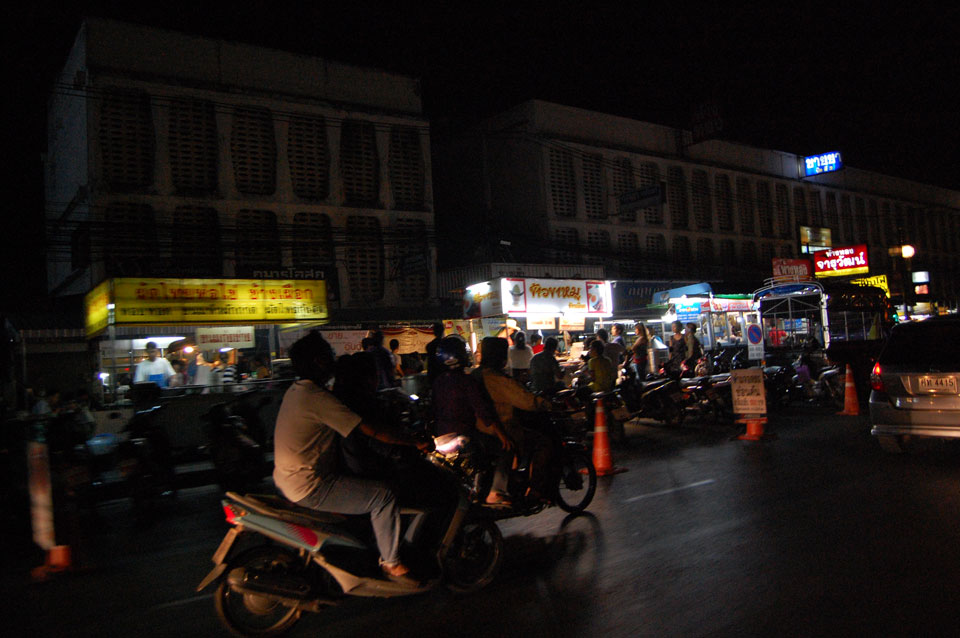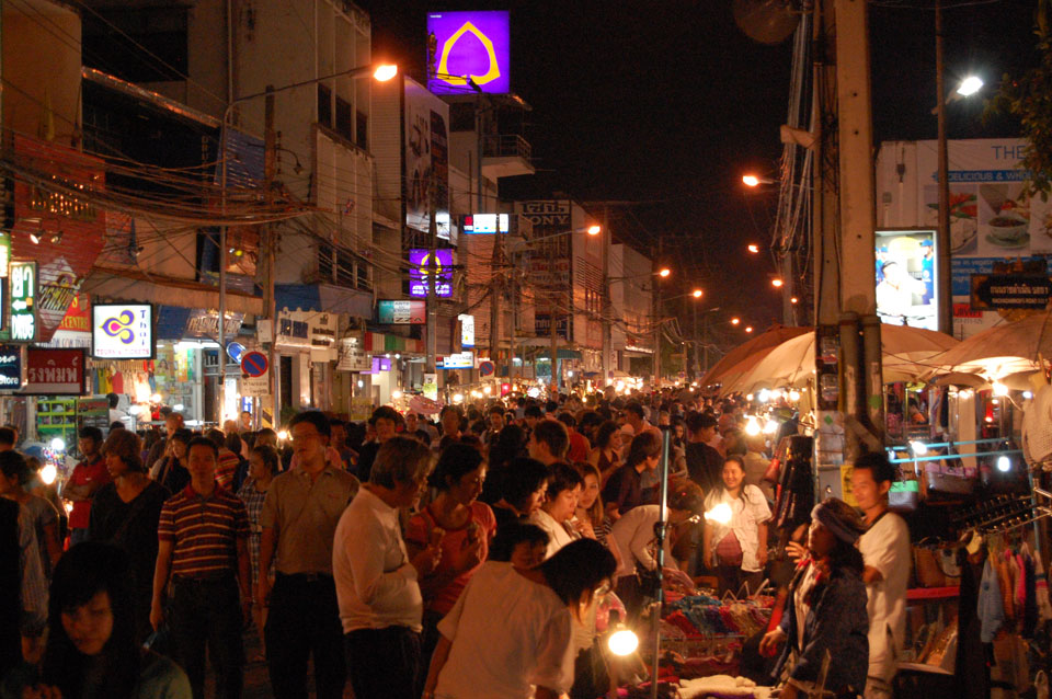 Im Hostel nahm ich neue Batterien auf und ging um 9 wieder raus. Heute zum Sonntag war der Nachtmarkt, eine große Attraktion. Ich ging zum Ost-Tor und war schon am Anfang wieder beeindruckt. So viele Leute und Verkäufer. Unzählige Kleinigkeiten wurden angeboten. Ich kaufte mir ein T-Shirt ohne zu handeln und schlenderte durch die Marktstraßen. Mir gefiel die Atmosphäre super – besser als in Bangkok, die Sachen waren auch ganz nett und spottbillig. Ein Schweinsblut-Curry und ein Gelee und noch ein Spieß – alles lecker.