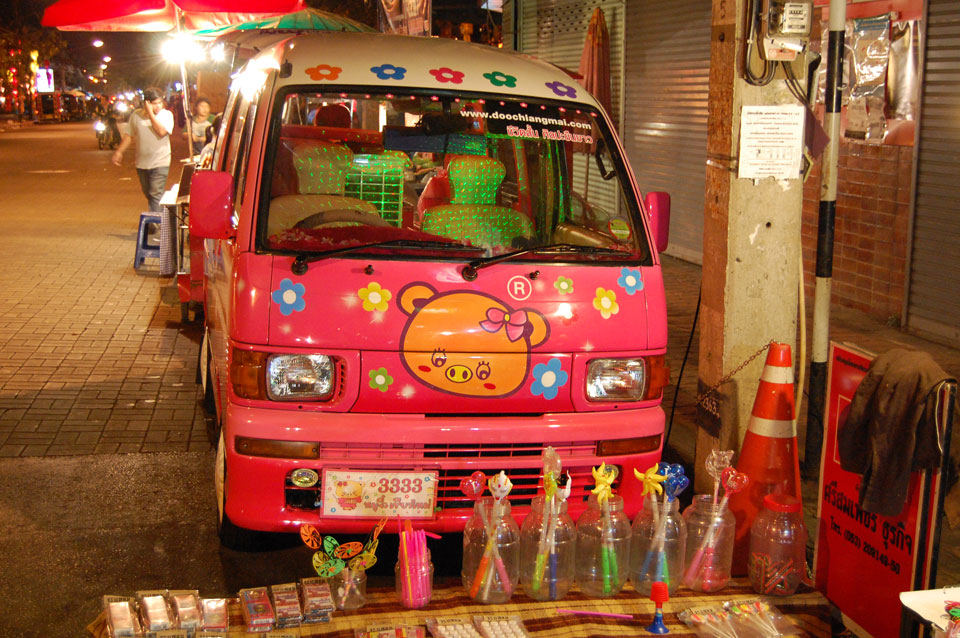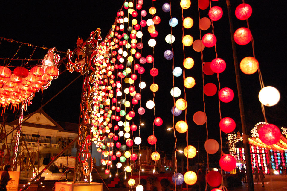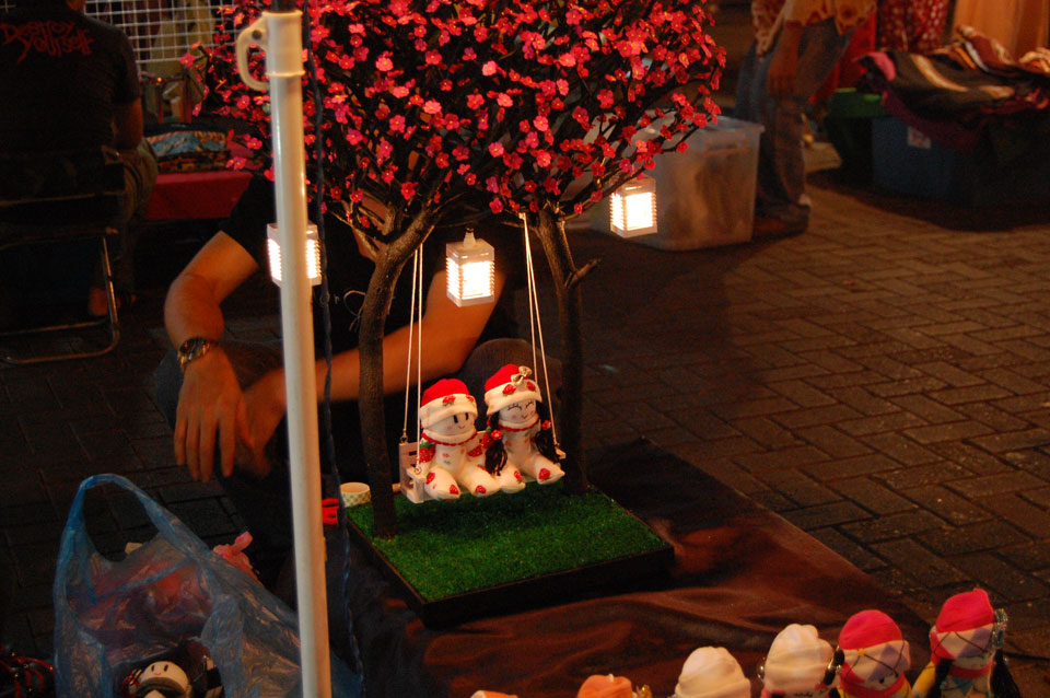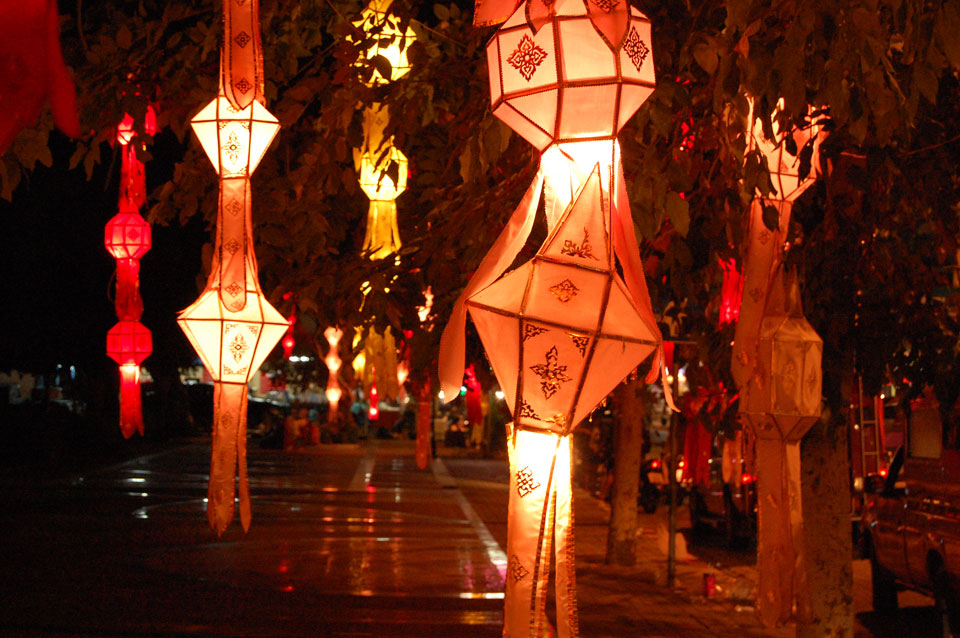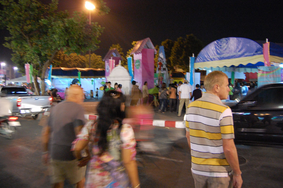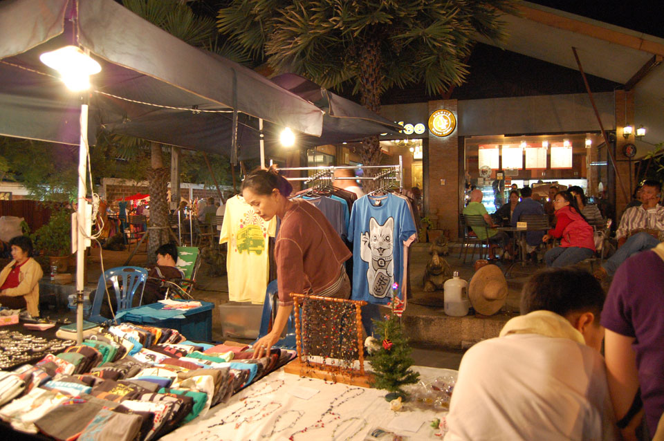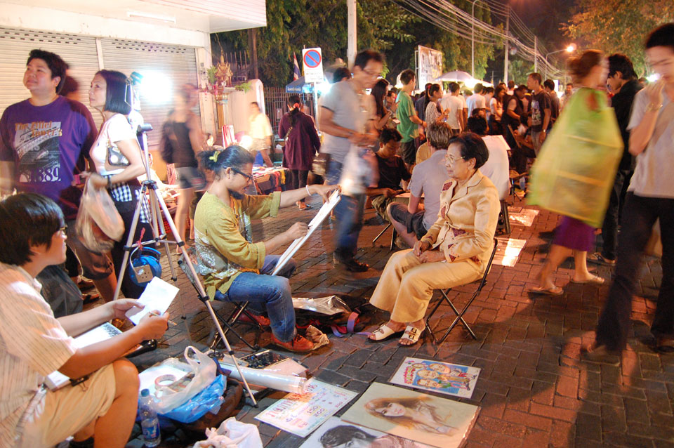 Im Hostel nahm ich neue Batterien auf und ging um 9 wieder raus. Heute zum Sonntag war der Nachtmarkt, eine große Attraktion. Ich ging zum Ost-Tor und war schon am Anfang wieder beeindruckt. So viele Leute und Verkäufer. Unzählige Kleinigkeiten wurden angeboten. Ich kaufte mir ein T-Shirt ohne zu handeln und schlenderte durch die Marktstraßen. Mir gefiel die Atmosphäre super – besser als in Bangkok, die Sachen waren auch ganz nett und spottbillig. Ein Schweinsblut-Curry und ein Gelee und noch ein Spieß – alles lecker.