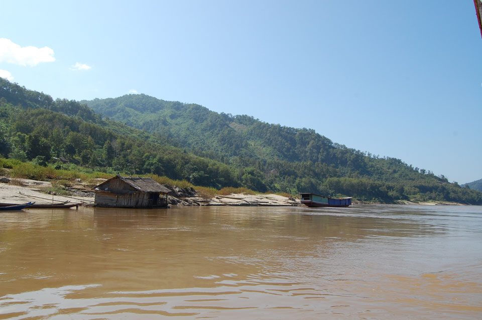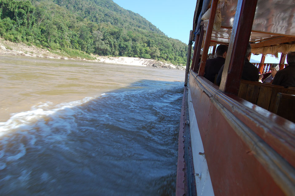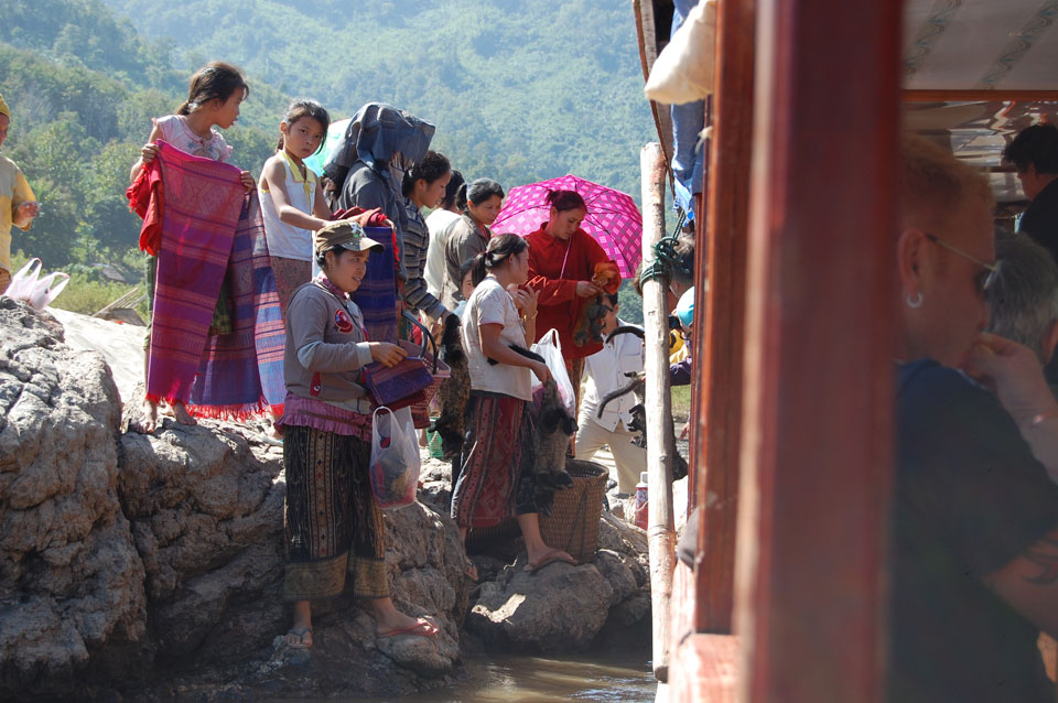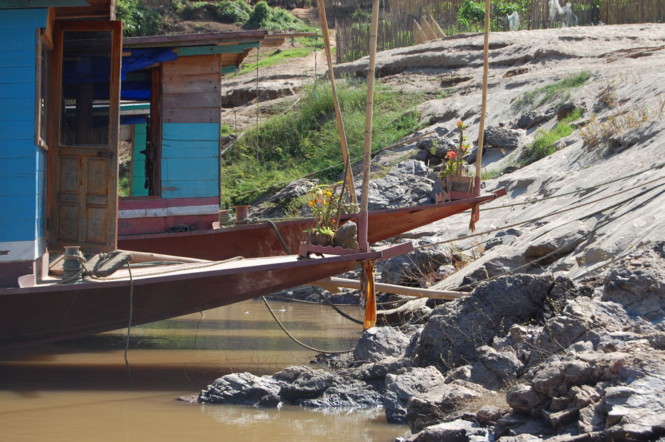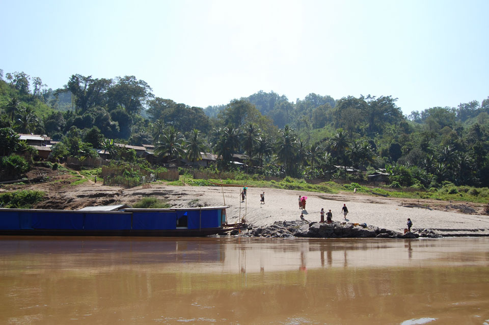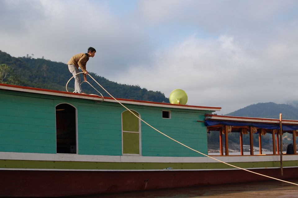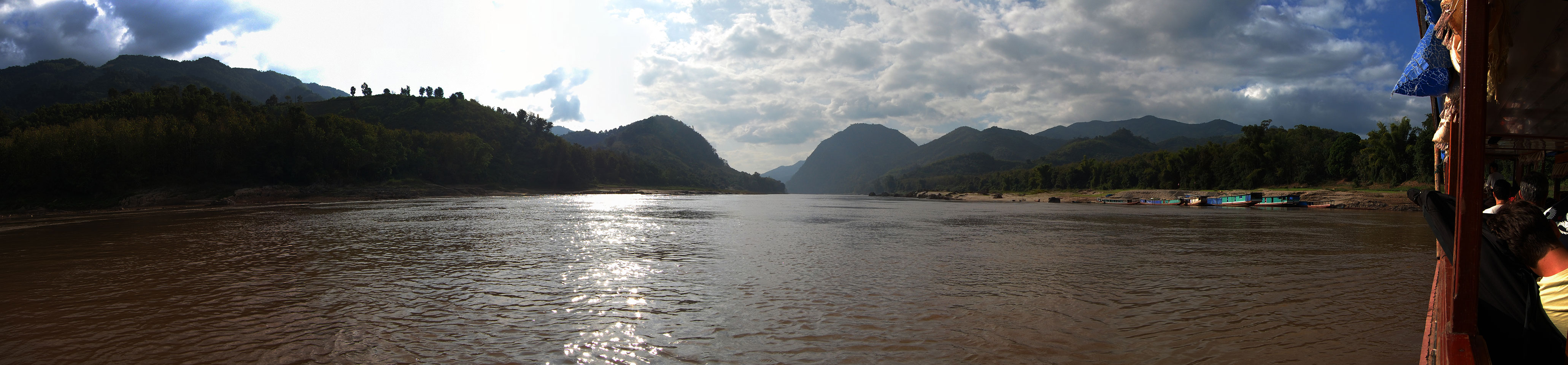 Ich genoss die Fahrt auf dem Mekong durch eine wunderbare Landschaft. Das war heute wieder eine nette Art zu reisen. An einem Halt wollten Dorfbewohner Sachen verkaufen – Stoffe und ein paar tote Waschbären? Mein Proviant war auch genau richtig – die restlichen Bananen von gestern verputzte ich auch noch. Irgendwie war ich dann doch etwas fertig – bissel Kopfschmerzen und müde.