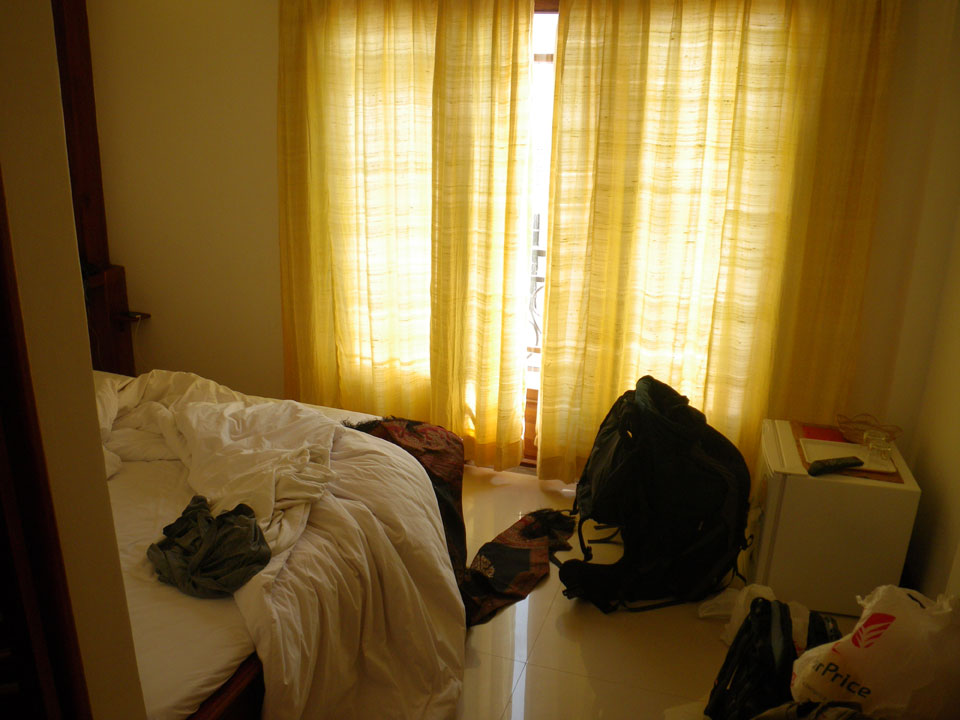 Ich checkte ein paar Gästehäuser und entschied mich dsnn für eins, dass von den Leuten Zuspruch bekam. Das Einzelzimmer für 3 EUR fand ich zu klein. Das Doppelzimmer für 5 war besser. Kleine Ameisen und merkwürdige Architektur aber alles easy.
