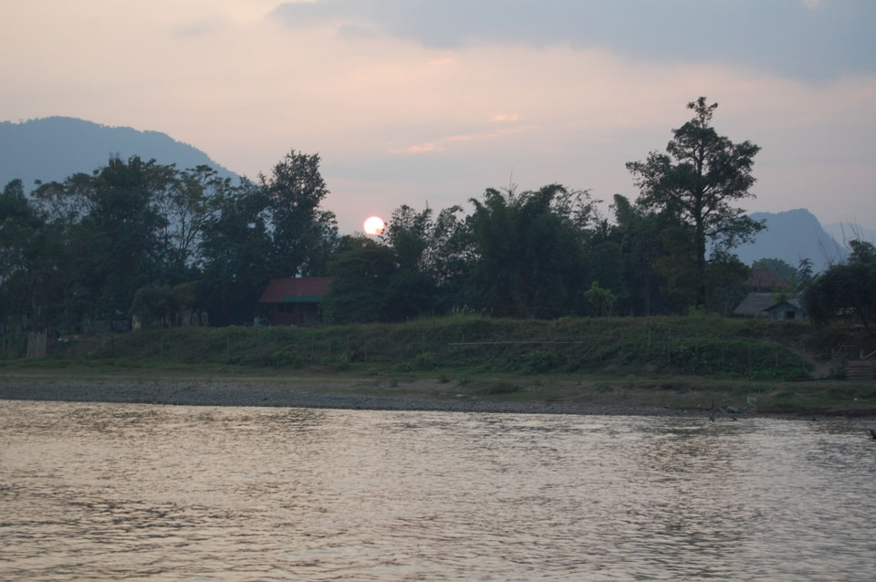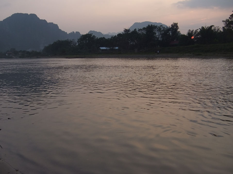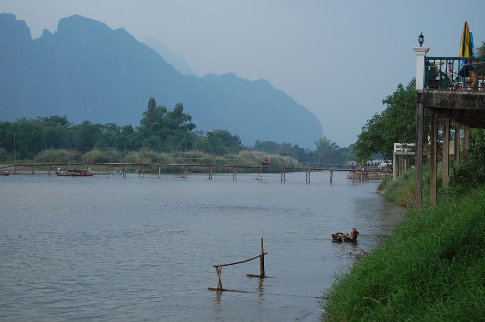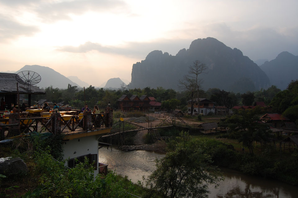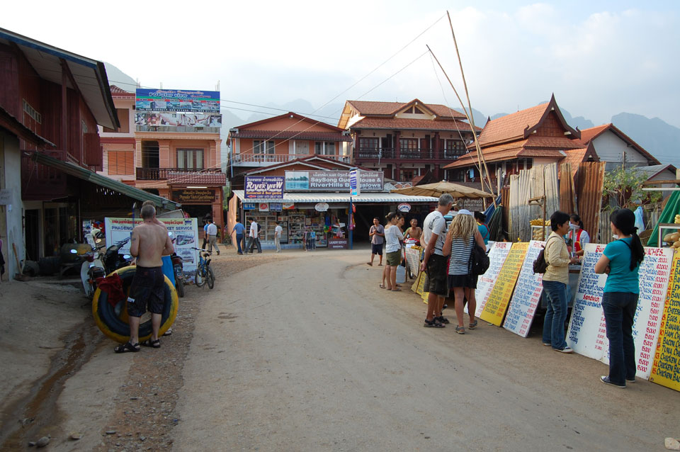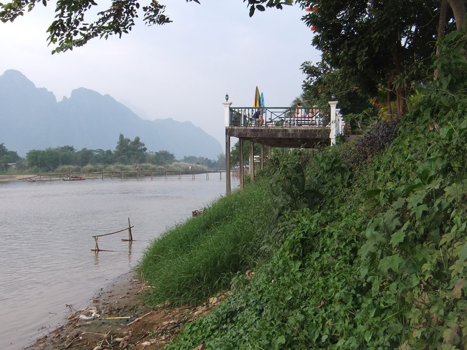 Im Zimmer meditieren, spielen, und dann um 11 was essen gehen. Scharfes Schwein mit Reis. Alles gut und günstig hier. Für den Abschluss die QBar, wie gestern. Leute gaben mir Whisky oder ein halbes Bier. Ich habe nun den Ort gesehen und kann mich um intessantere Sachen kümmern. Tubing muss wohl sein.