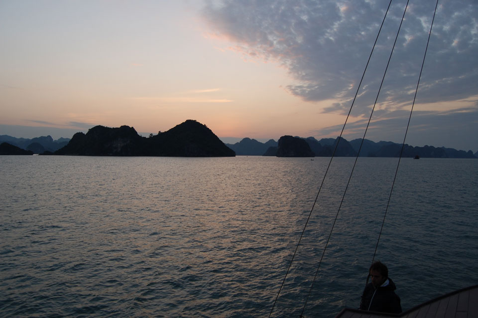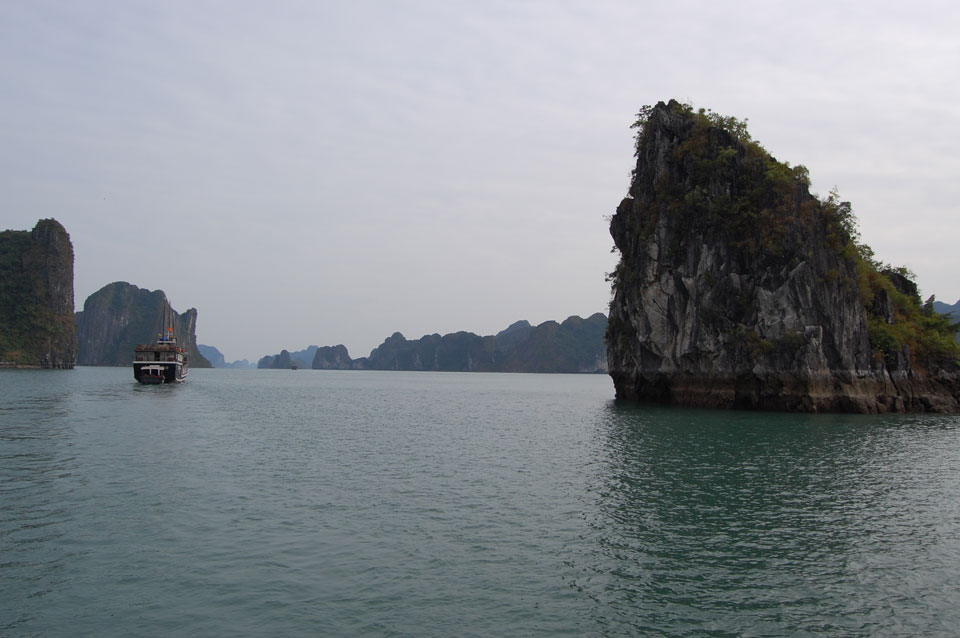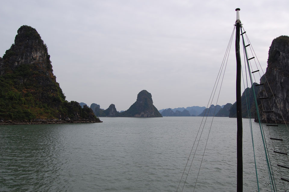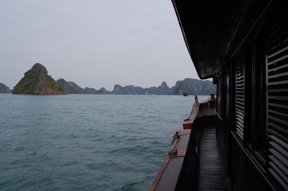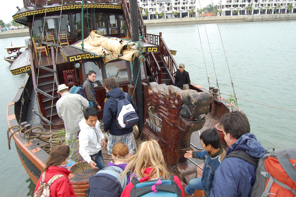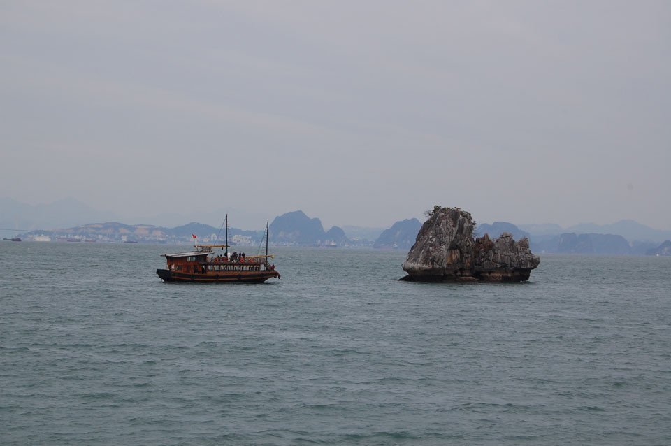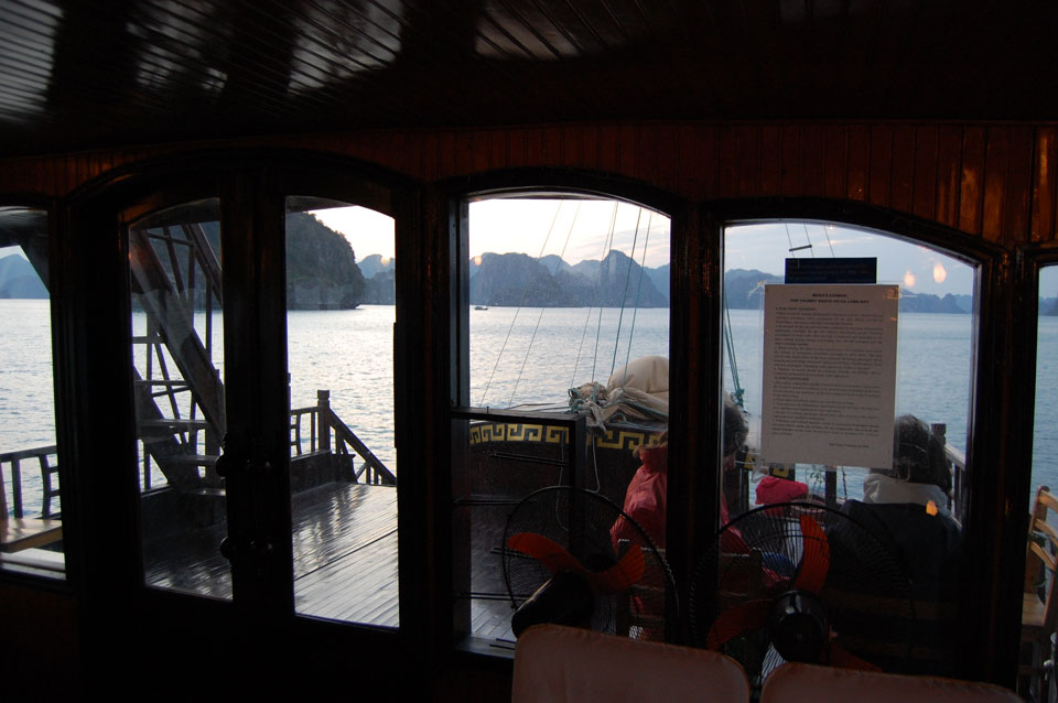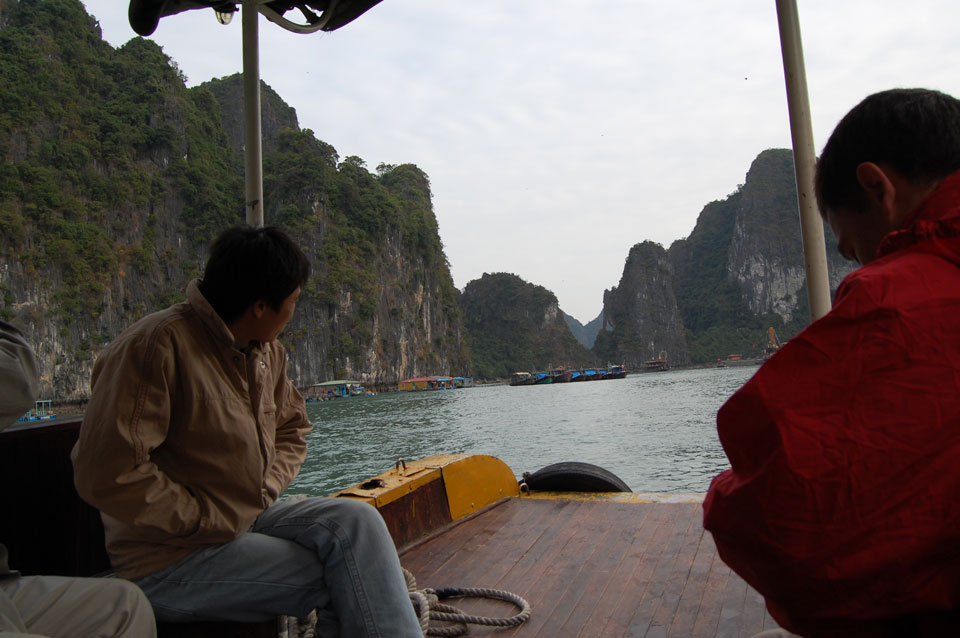 Nachdem der Bus alle eingesackt hatte, war der Bus nicht mal halb voll. Das Wetter heute war sehr kalt und bedeckt. Ohne Heizung im Bus zog ich doch zwei Pullover an. Am Zwischenstopp kam ein heisser Kaffee genau richtig und Cashew Nüsse waren auch OK. In Halong Bay gingen wir auf’s Boot. Das schöne Zimmer teile ich mit einem Schweizer.