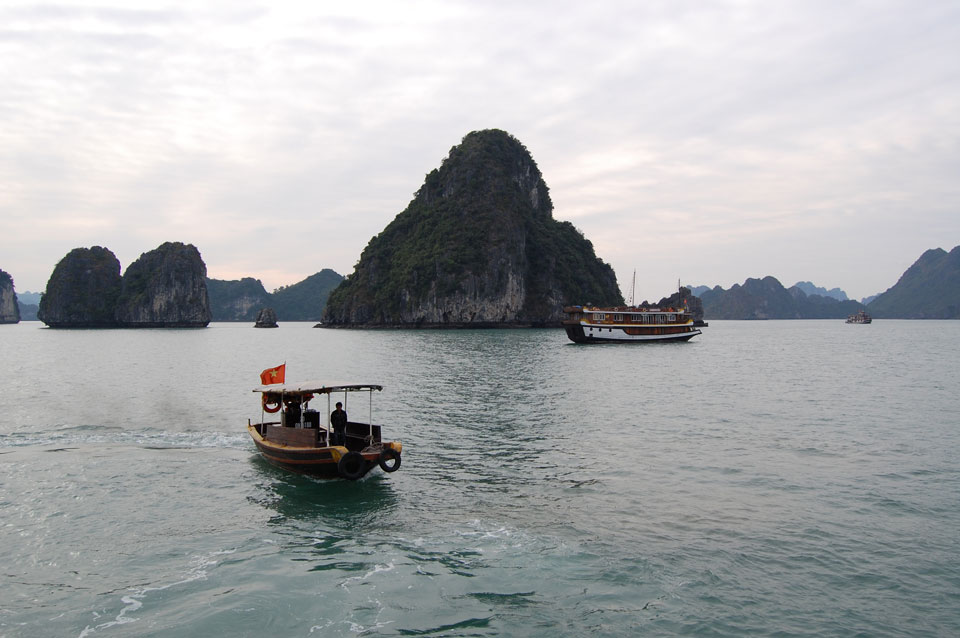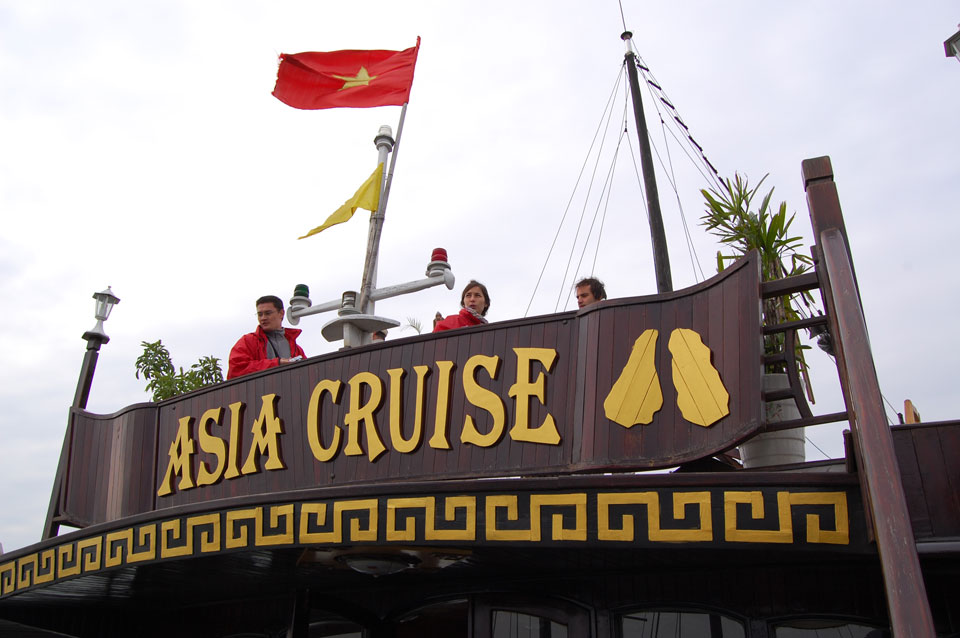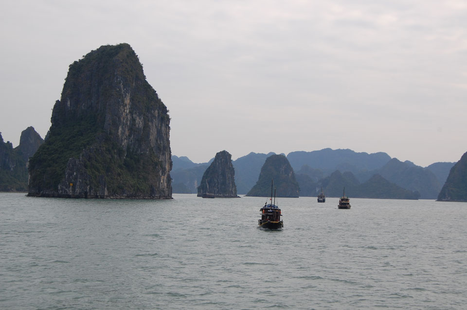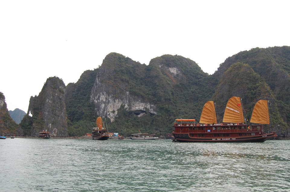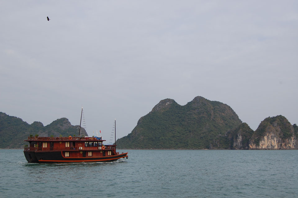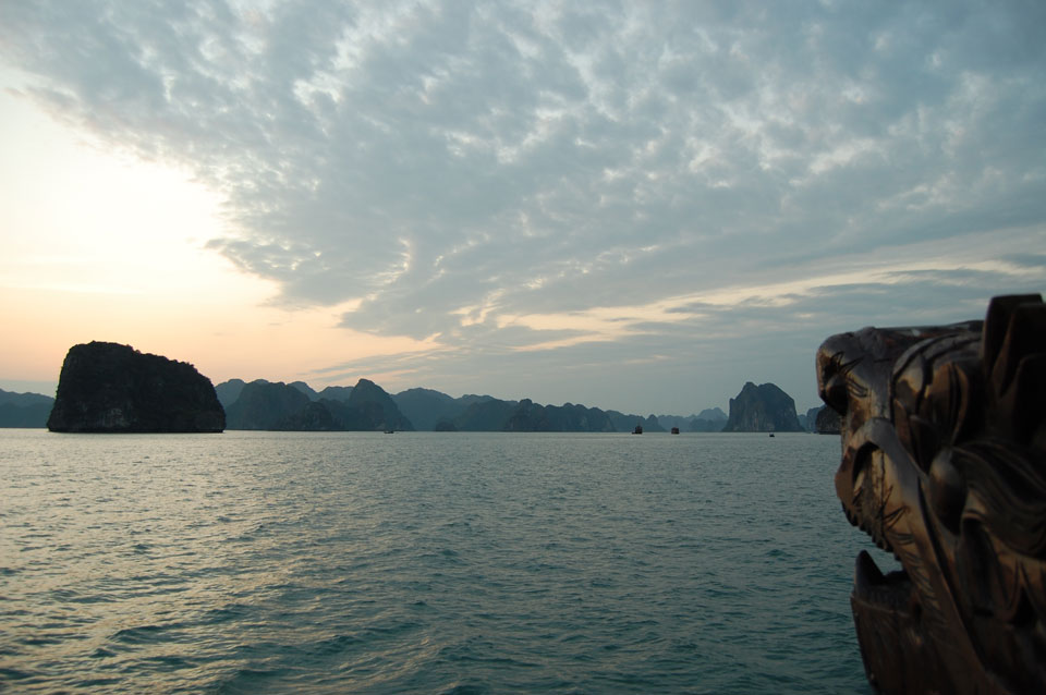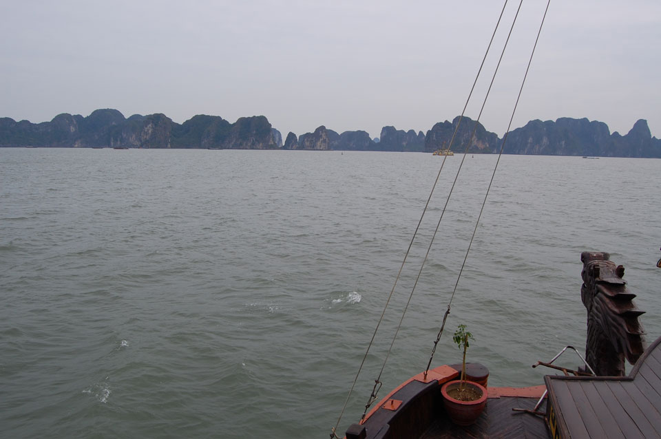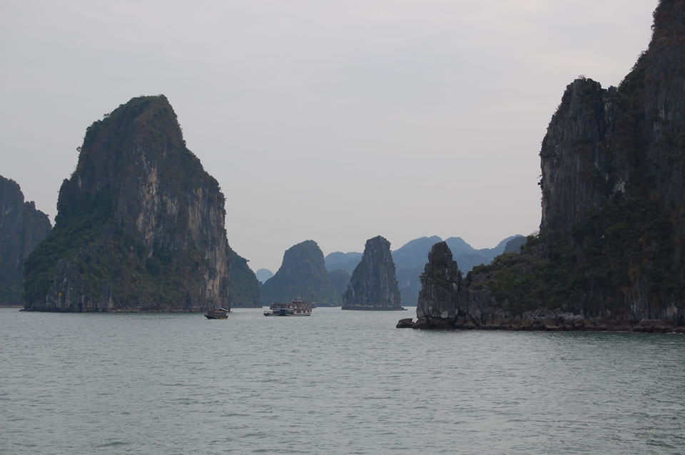 Nachdem der Bus alle eingesackt hatte, war der Bus nicht mal halb voll. Das Wetter heute war sehr kalt und bedeckt. Ohne Heizung im Bus zog ich doch zwei Pullover an. Am Zwischenstopp kam ein heisser Kaffee genau richtig und Cashew Nüsse waren auch OK. In Halong Bay gingen wir auf’s Boot. Das schöne Zimmer teile ich mit einem Schweizer.