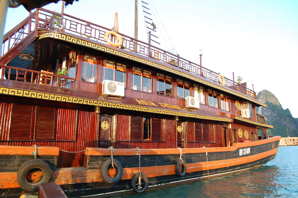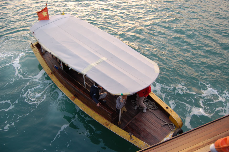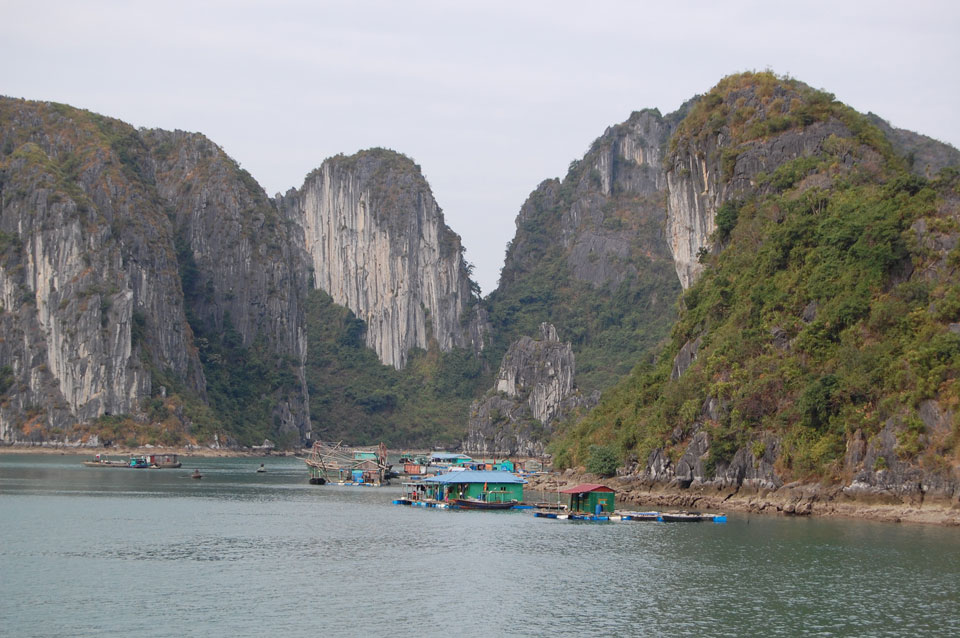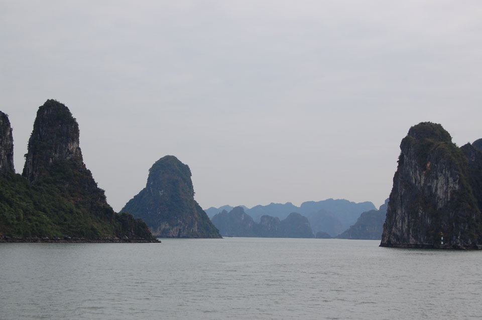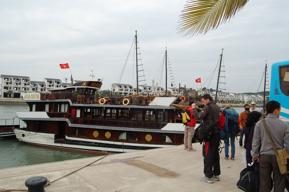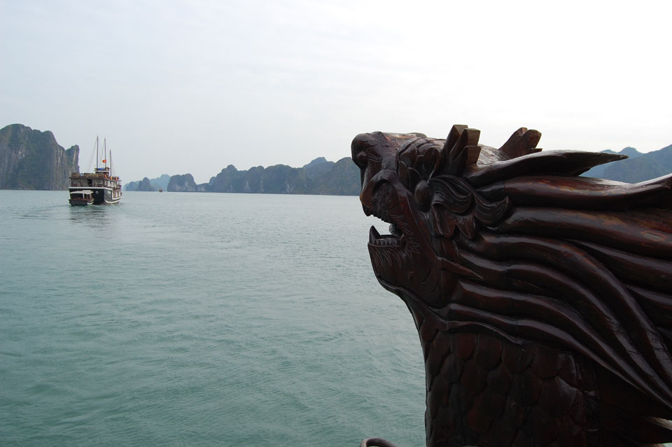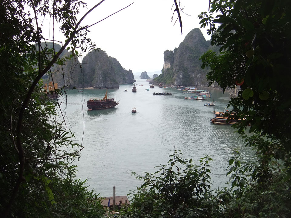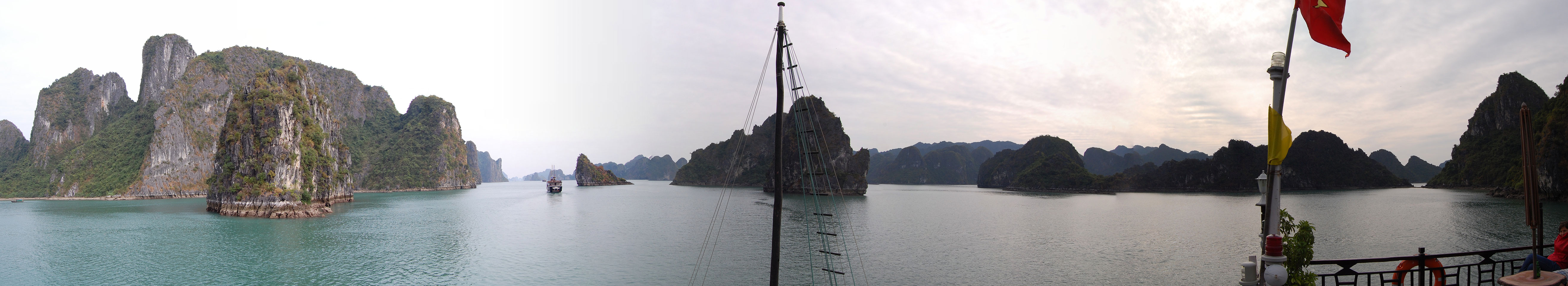 Nachdem der Bus alle eingesackt hatte, war der Bus nicht mal halb voll. Das Wetter heute war sehr kalt und bedeckt. Ohne Heizung im Bus zog ich doch zwei Pullover an. Am Zwischenstopp kam ein heisser Kaffee genau richtig und Cashew Nüsse waren auch OK. In Halong Bay gingen wir auf’s Boot. Das schöne Zimmer teile ich mit einem Schweizer.
