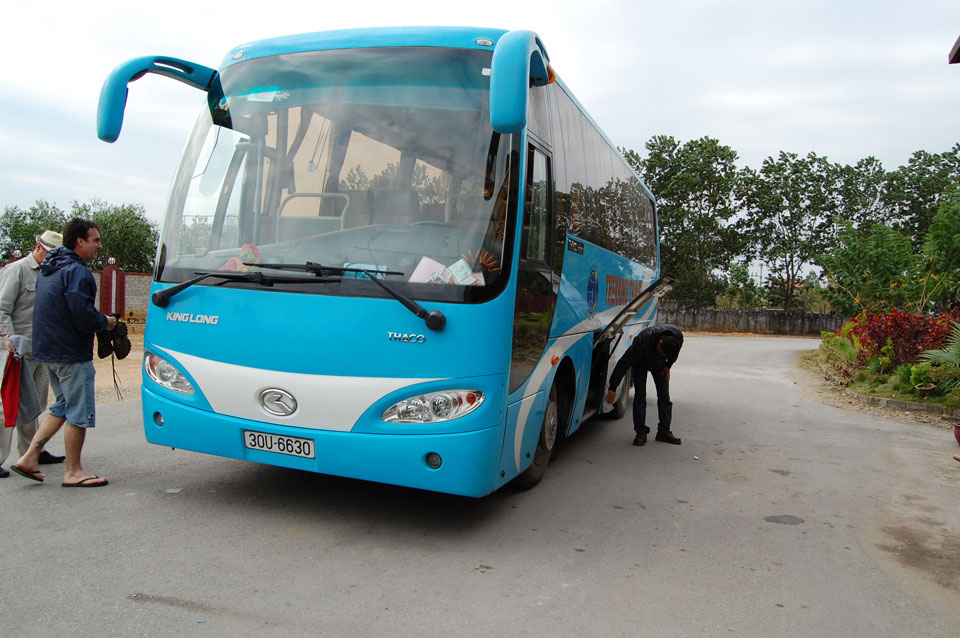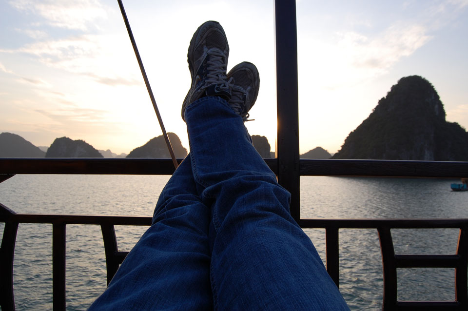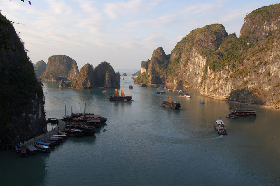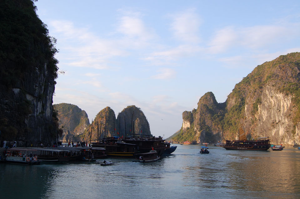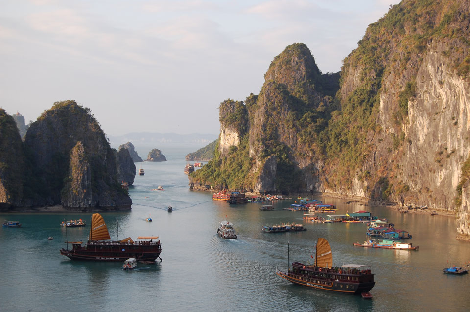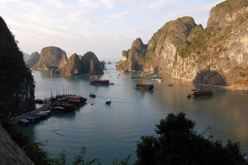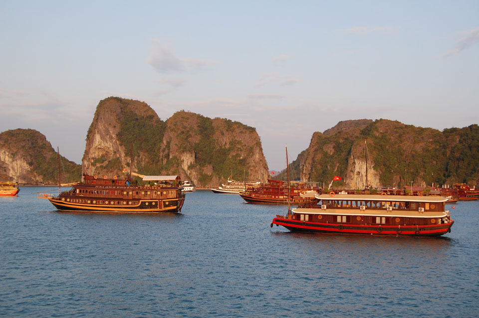 Nachdem der Bus alle eingesackt hatte, war der Bus nicht mal halb voll. Das Wetter heute war sehr kalt und bedeckt. Ohne Heizung im Bus zog ich doch zwei Pullover an. Am Zwischenstopp kam ein heisser Kaffee genau richtig und Cashew Nüsse waren auch OK. In Halong Bay gingen wir auf’s Boot. Das schöne Zimmer teile ich mit einem Schweizer.