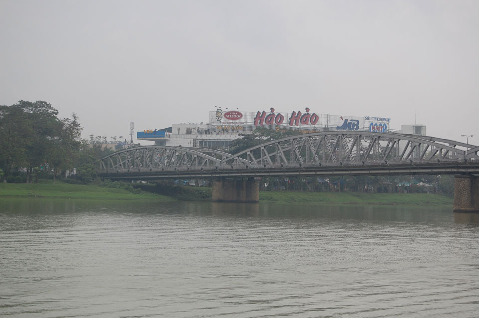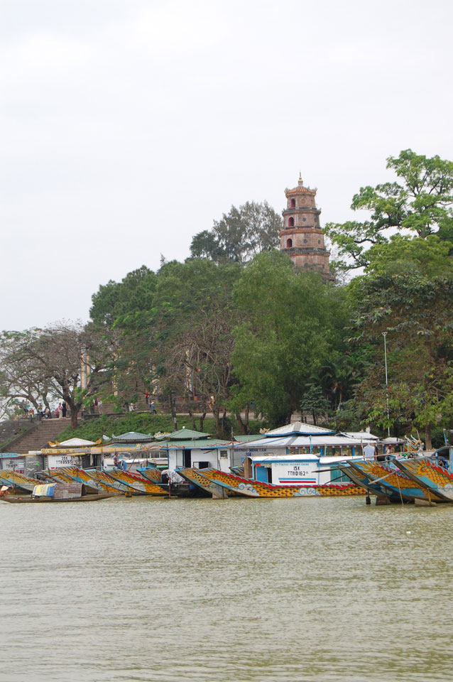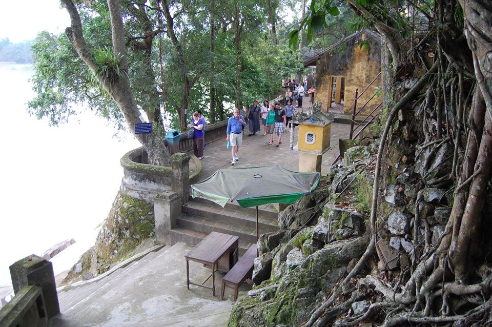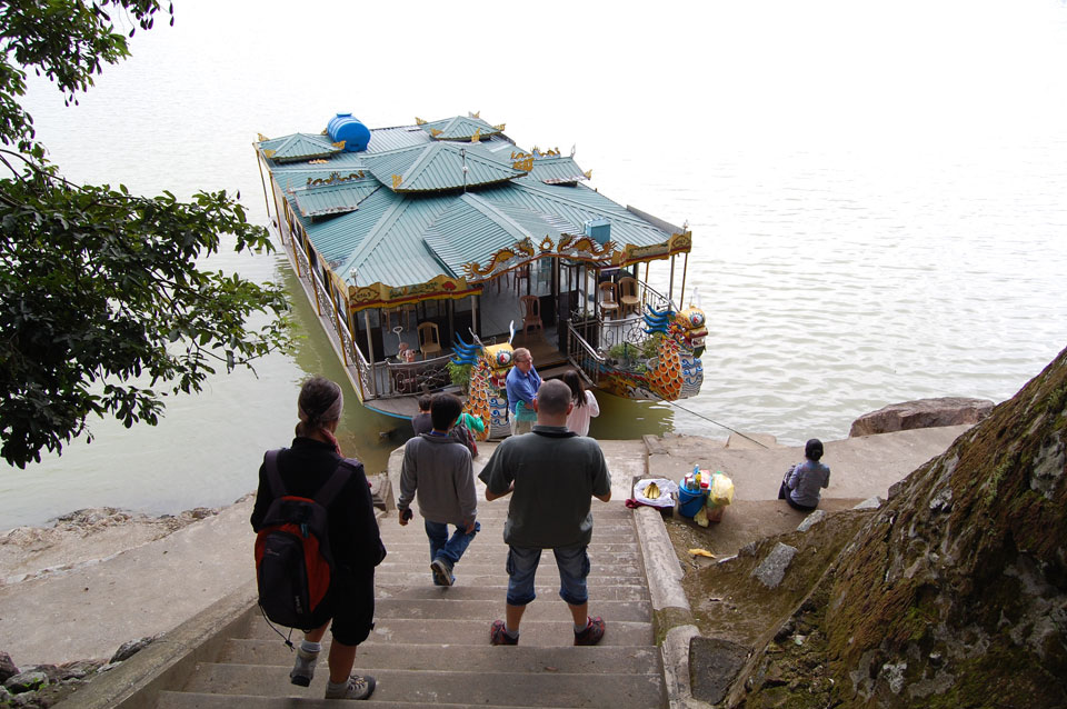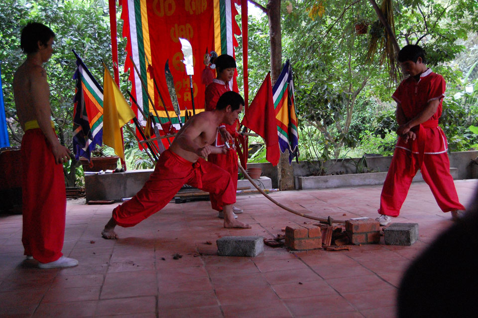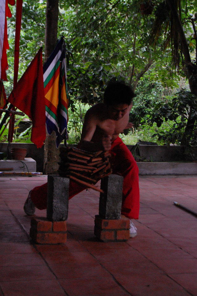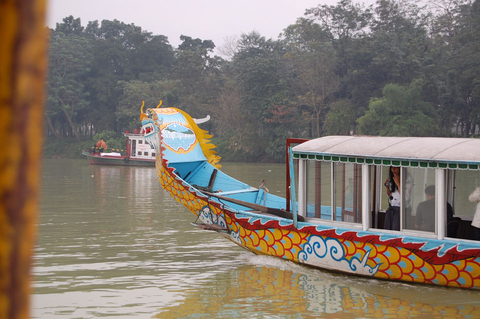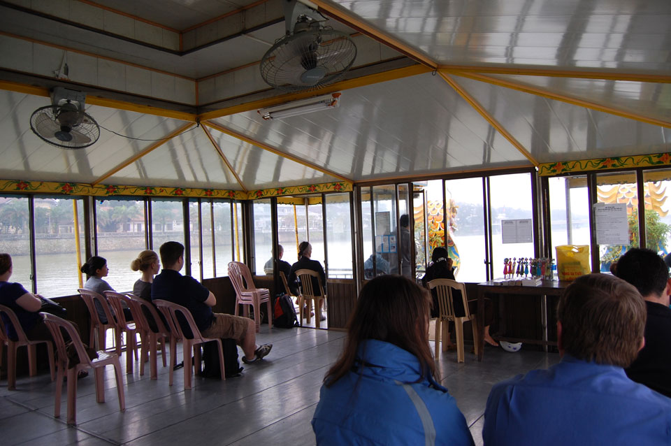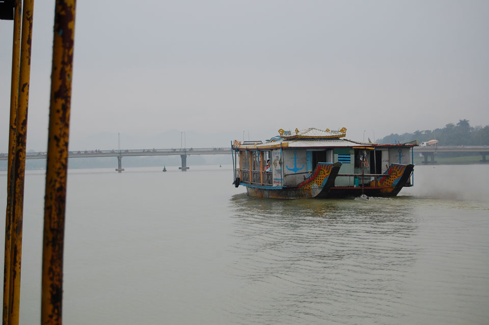 Die Einführung des Reiseführers lief schon und dann ging es los auf dem Perfume River. Der erste Stopp stand nicht auf dem Programm und war eine Kung Fu Demo. Für 30K waren ein paar Schaukämpfe auf dem Programm. Als dann mit Blechschwertern humgefuchtelt wurde, flog so manches entwedeer auf den Boden, eins auch in’s Gebüch. Ich hatte nun etwas Bammel, inw der ersten Reihe zu sitzen und suchte leichte Deckung. Das obligatorische Ziegelzerkrachen kam auch, zu wenig Licht für die D40 bei den ganzen Action.