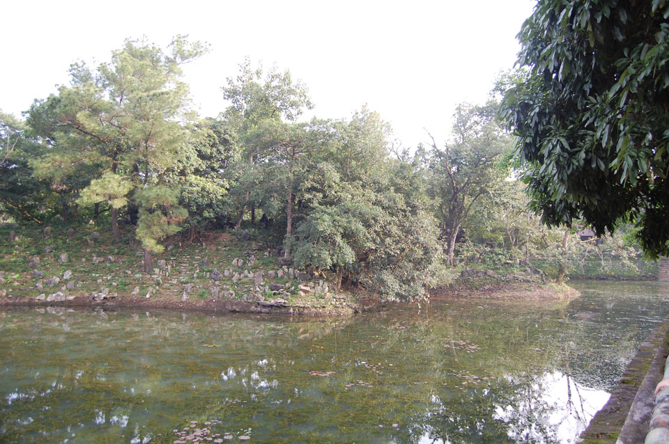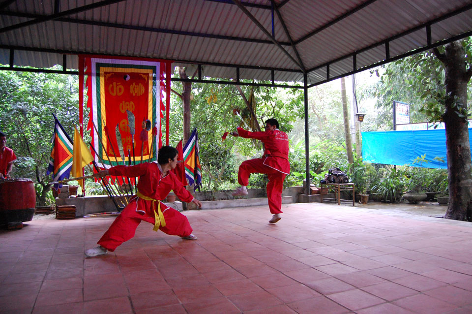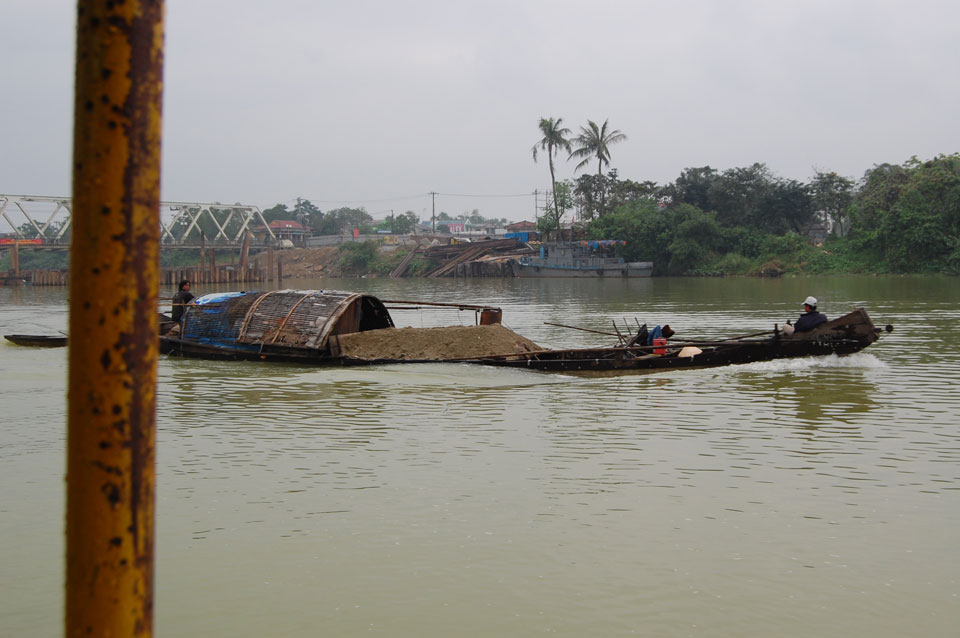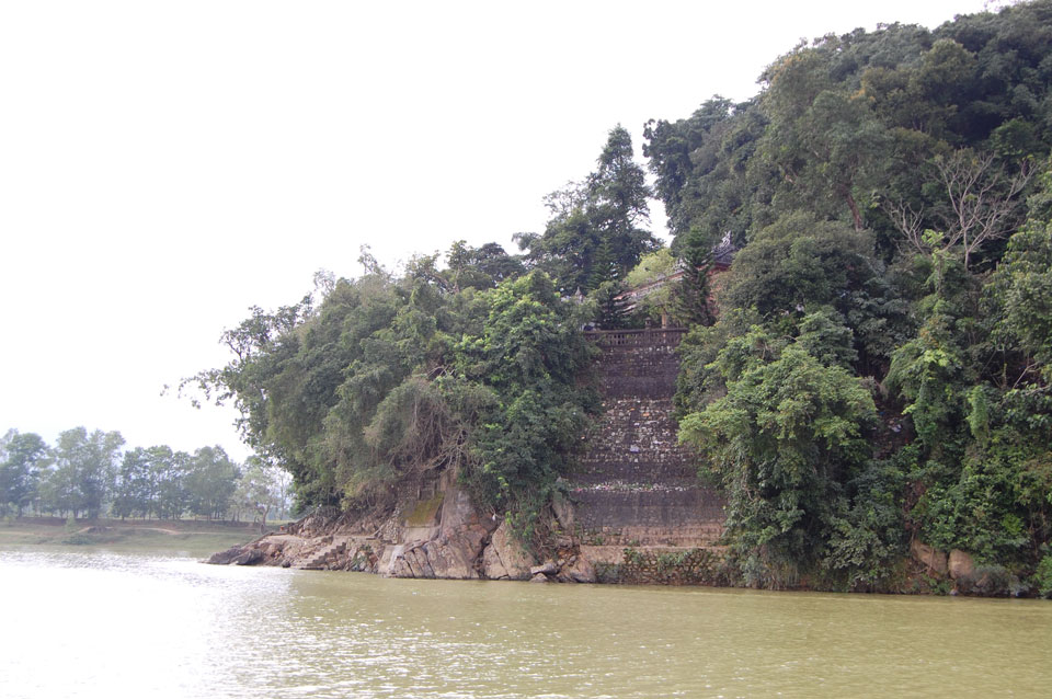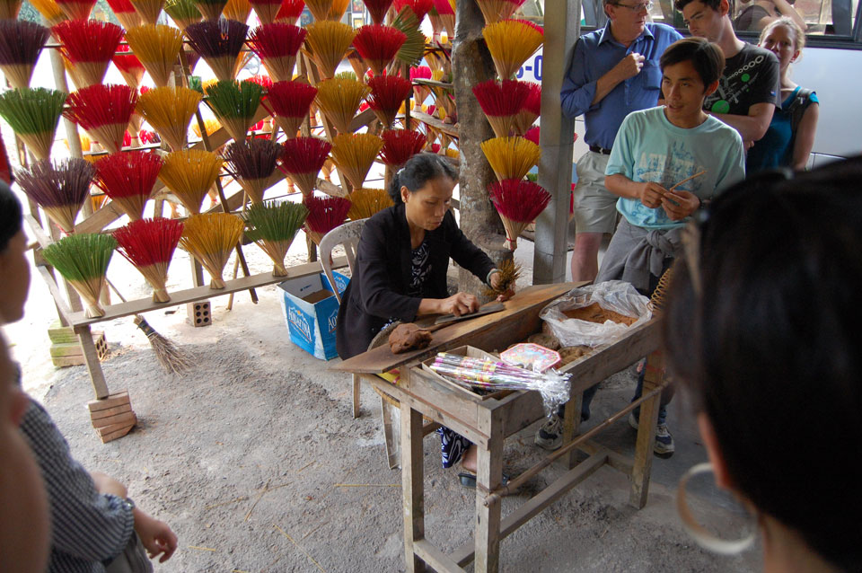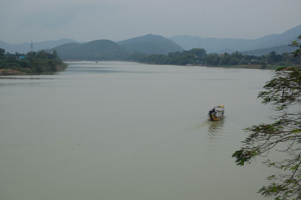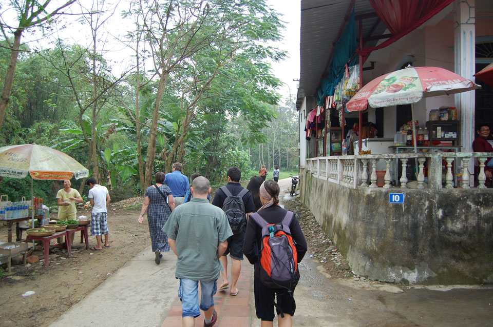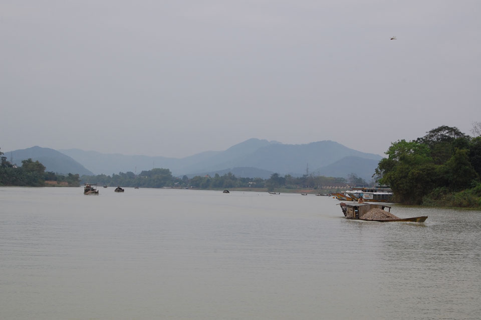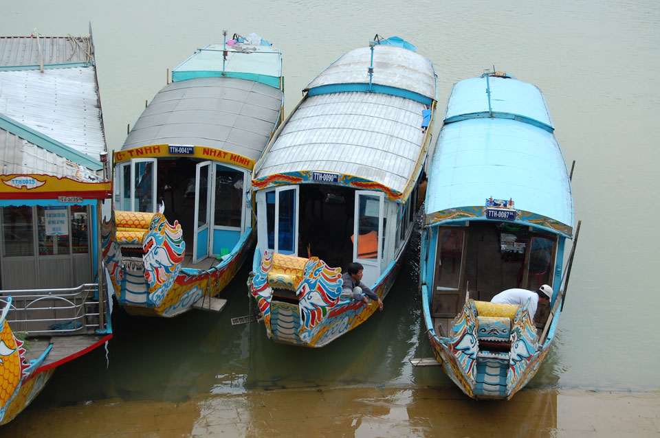 Die Einführung des Reiseführers lief schon und dann ging es los auf dem Perfume River. Der erste Stopp stand nicht auf dem Programm und war eine Kung Fu Demo. Für 30K waren ein paar Schaukämpfe auf dem Programm. Als dann mit Blechschwertern humgefuchtelt wurde, flog so manches entwedeer auf den Boden, eins auch in’s Gebüch. Ich hatte nun etwas Bammel, inw der ersten Reihe zu sitzen und suchte leichte Deckung. Das obligatorische Ziegelzerkrachen kam auch, zu wenig Licht für die D40 bei den ganzen Action.