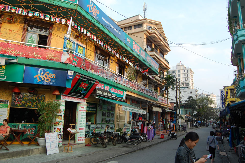 Das Abendessen war fantastisch: Banh Hue (Reistaschen mit Shrimps und anderen Fischsachen), Banh Khoai (Crepe mit Gemüse und Salat) und nach langer Wartezeit dann noch gefüllte Tintenfische mit Nudeln, Pilzen und so. Dazu trank ich zwei Bier (Huda, Hue) und bezahlte mit Trinkgeld gerade 150K – €6.50. Vietnam ist echt günstig, die Leute nett und das Essen super.