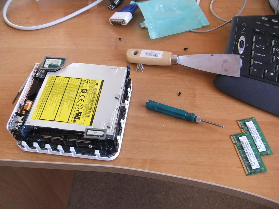 In den Mac mini baute ich die 4 GB RAM ein. Ich hatte dafür sogar ’nen Spachtel aus Deutschland mitgebracht. Eine Schraube war locker, nochmal auf und es klappte alles. Mit der externen Festplatte klappte auch alles, nur der 1280×1024 px Monitor ist eben zu klein. Die russisch/engl. Tastatur muss auch reichen.