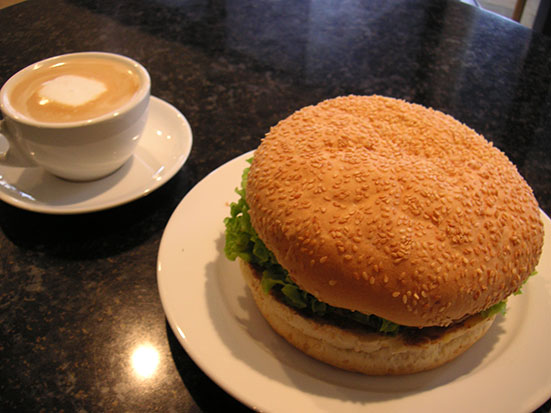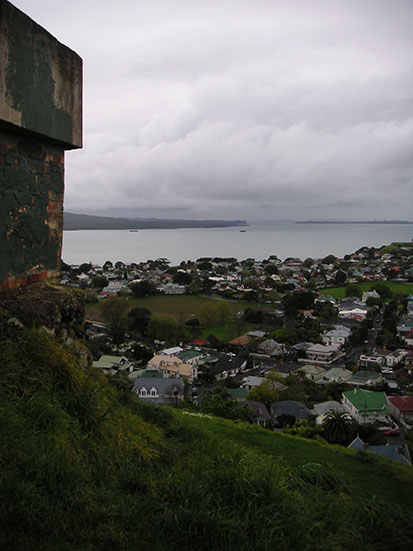 In Devonport spazierte ich bissel herum. Viele Cafés hatten bereits geschlossen, die Pubs machten erst auf. Ich wollte erst mal was essen und nicht geräuchert werden und setzte mich in eine kleine Burger-Bar. Dort bestellte ich einen Vegetarischen(!) Burger und ’nen Café. Ein Riesenteil, der Burger, und sehr gut. Gestärkt konnte ich den auf den Mount Victoria kraxeln. Das ist ein stiller Vulkan, der auch zur Verteidigung gegen möglicheInvasoren (Russen und Japaner) gut geeignet war. Da gab’s ’nen Bunker (jetzt von einer Folk Musikgruppe genutzt) und eben einen Aussichtpunkt.