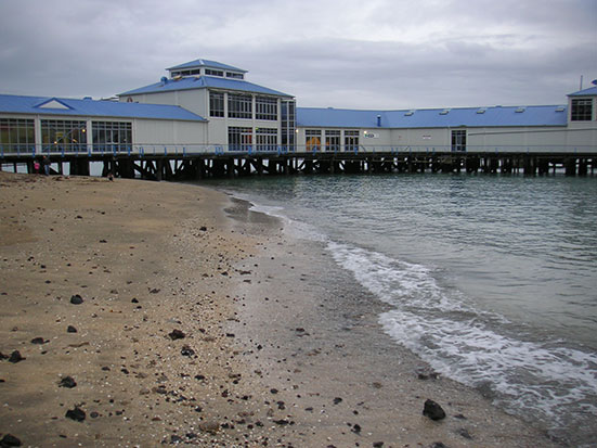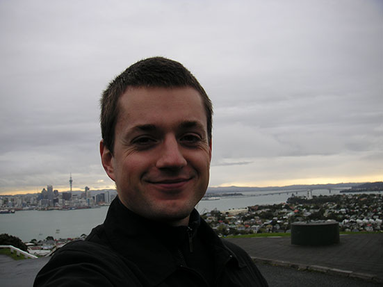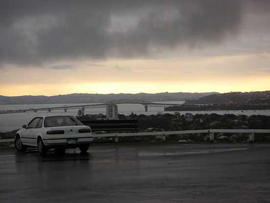 Das Wetter klarte kurz etwas auf und ich konnte die ganze North Shore samt Harbor Bridge sehen — natürlich auch Downtown Auckland mit dem unübersehbaren Sky Tower. Ringsum gab es noch andere Inseln. Das war echt super und ich wollte gleich bis zum Sonnenuntergang bleiben. Dann setzte aber wieder der Regen ein und es ging erst mal wieder bergabwärts. Ich aß ein Eis und ging nochmal kurz runter zu einem kleinen „Strand“ neben dem Fähr-Pier. Da knipste mich ein freundlicher Kiwi. Er bot mir das Photographieren an und sein Bier steht auch im Bild. Prosit!