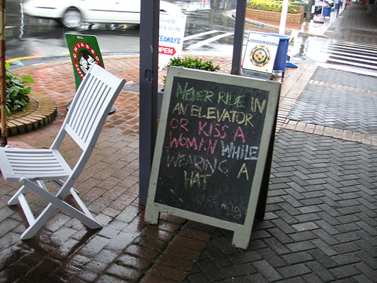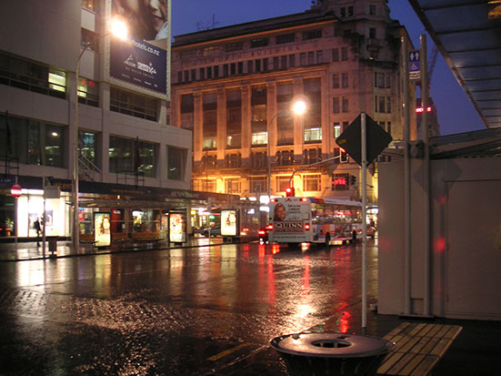 Es wurde finster und ich hüpfte auf eine Fähre. Irgendwie war die aber falsch ausgeschildert und ich ging dann zusammen mit ein paar anderen Irrläufern fix wieder zurück. Das Ticket war gestempelt aber machte dann keine Probleme. Die nächste Fähre kam und ich war in Auckland, wo ich erneut von viel fliegendem Wasser begrüßt wurde. Ahoihoi! Irgendwie macht das dann gar nichts mehr aus — wenn man nicht mehr nasser werden kann. So störte mich bei dem Wetter ein riesiger unfreiwilliger Umweg zu meinem Appartment auch nicht mehr. (Jedenfalls redete ich mir das ein)